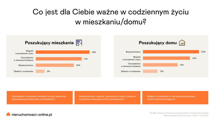 W przypadku osób poszukujących domu najważniejszą potrzebą jest natomiast bezpieczeństwo (50%). Dalej na liście priorytetów są wygoda i oszczędność czasu (42%), oszczędność w domowym budżecie (31%) i dbałość o środowisko (13%).