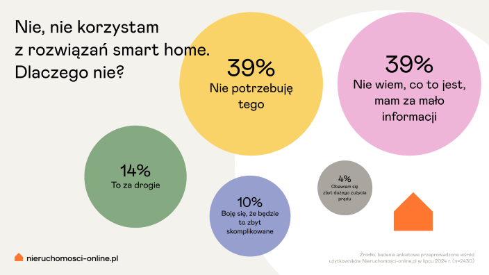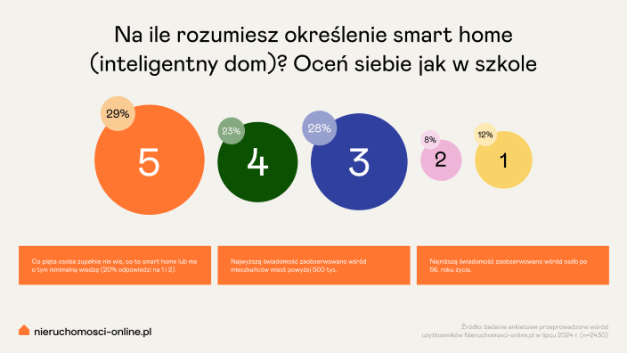 W ramach badania „Mieszkać dobrze. Potrzeby kupujących a rozwiązania technologiczne”, sprawdzono też, jak dalece osoby poszukujące nieruchomości rozumieją samo określenie inteligentny dom. 29 proc. ankietowanych oceniło swoją wiedzę w tym zakresie jako „bardzo dobrą”, 23 proc. jako „dobrą”, 28 proc. jako „średnią”, 8 proc. jako „minimalną”, a 12 proc. kompletnie nie wiedziało, czym jest SmartHome.