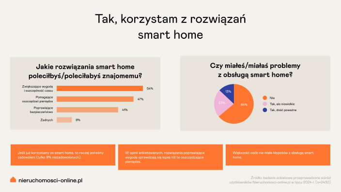 W badaniu przeprowadzonym przez Nieruchomosci-online.pl i firmę Samsung zapytano też osoby korzystające ze SmartHome, czy miały problemy z obsługą inteligentnych urządzeń. 64% osób odpowiedziało, że nie miało z tym żadnych problemów. Niewielkie problemy napotkało 23% respondentów, a poważniejsze kłopoty miało 13% z nich.