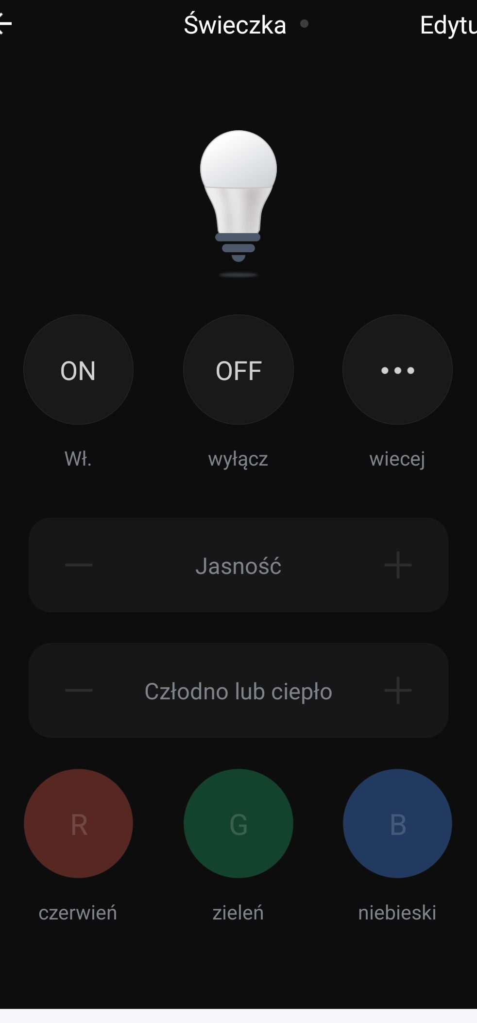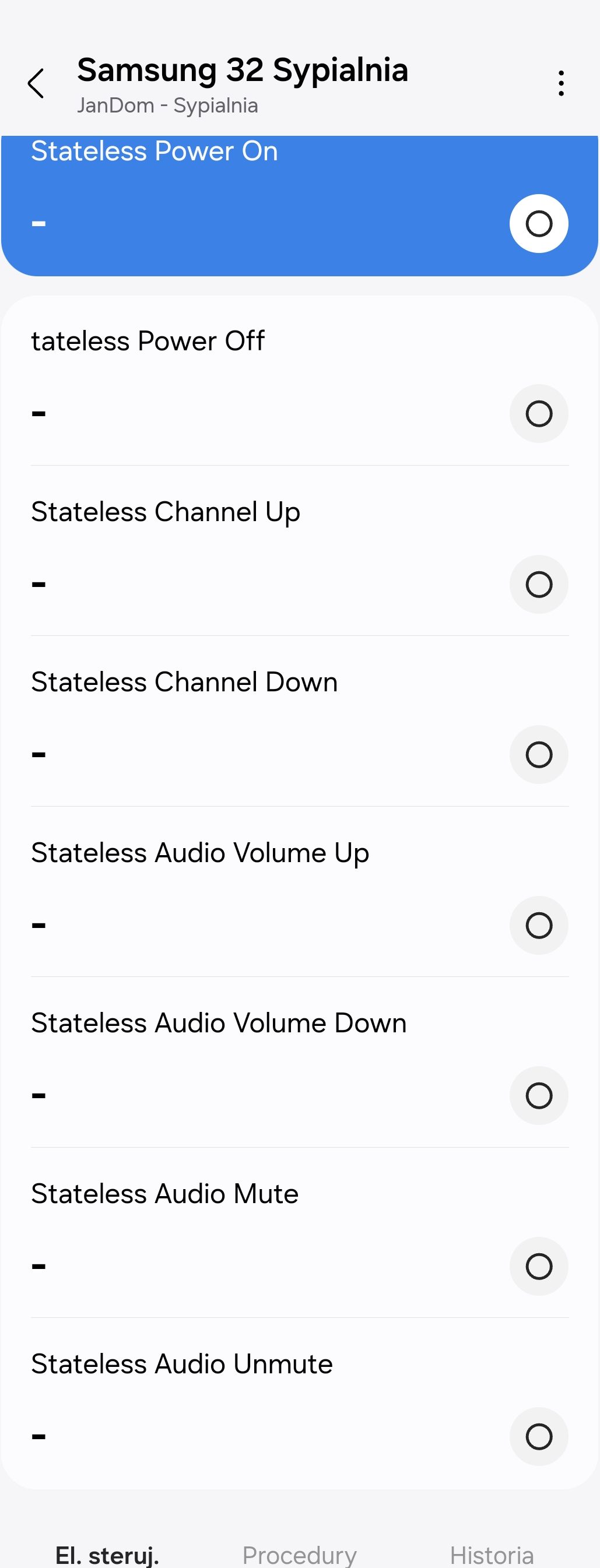Niestety przy radiu funkcjonalność jest mocno ograniczona: Włącz/Wyłącz bez aktualizacji statusu: jeśli urządzenie włączymy zwykłym pilotem, nadal w aplikacji SmarThings będzie widniał status wyłączenia. Uwaga: Sygnał wyłączenia, również włącza Amplituner lub radio.