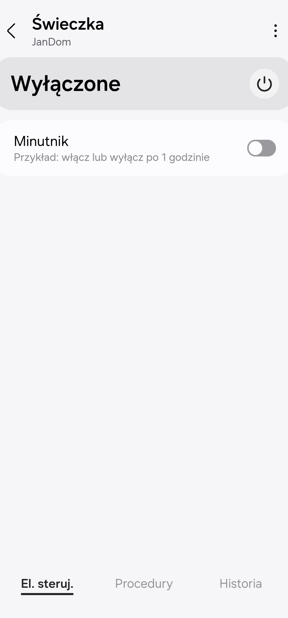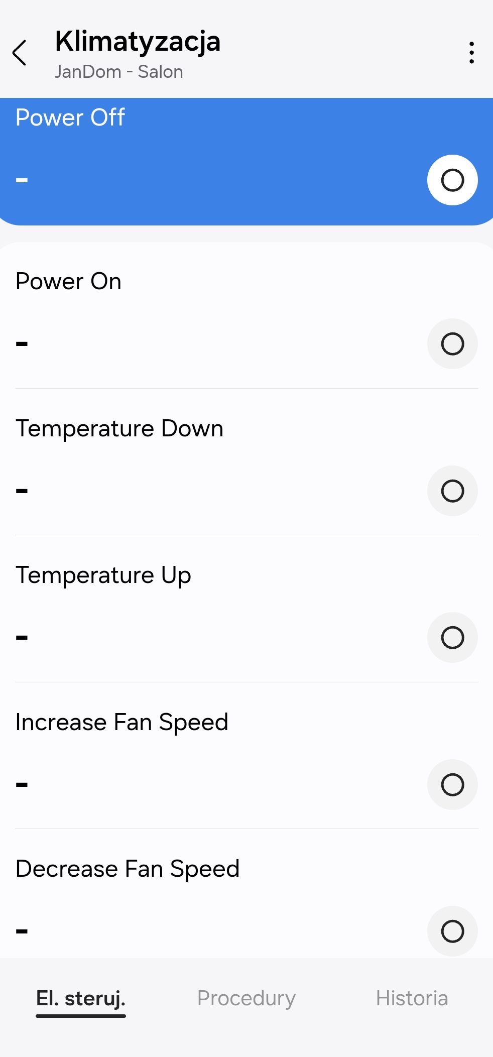 Brak podglądu temperatury, sygnał wyłączenia nie spowoduje włączenia urządzania (tak jak w przypadku amplitunera), dzięki czemu możemy zaprogramować automatyzację wyłączenia lub włączenia klimatyzacji. Brak temperatury wynika z ograniczeń komunikacji IR, jeśli zmienimy temperaturę na pilocie od klimatyzacji to nie pojawi się ona w aplikacji Tuya lub SmartThings.