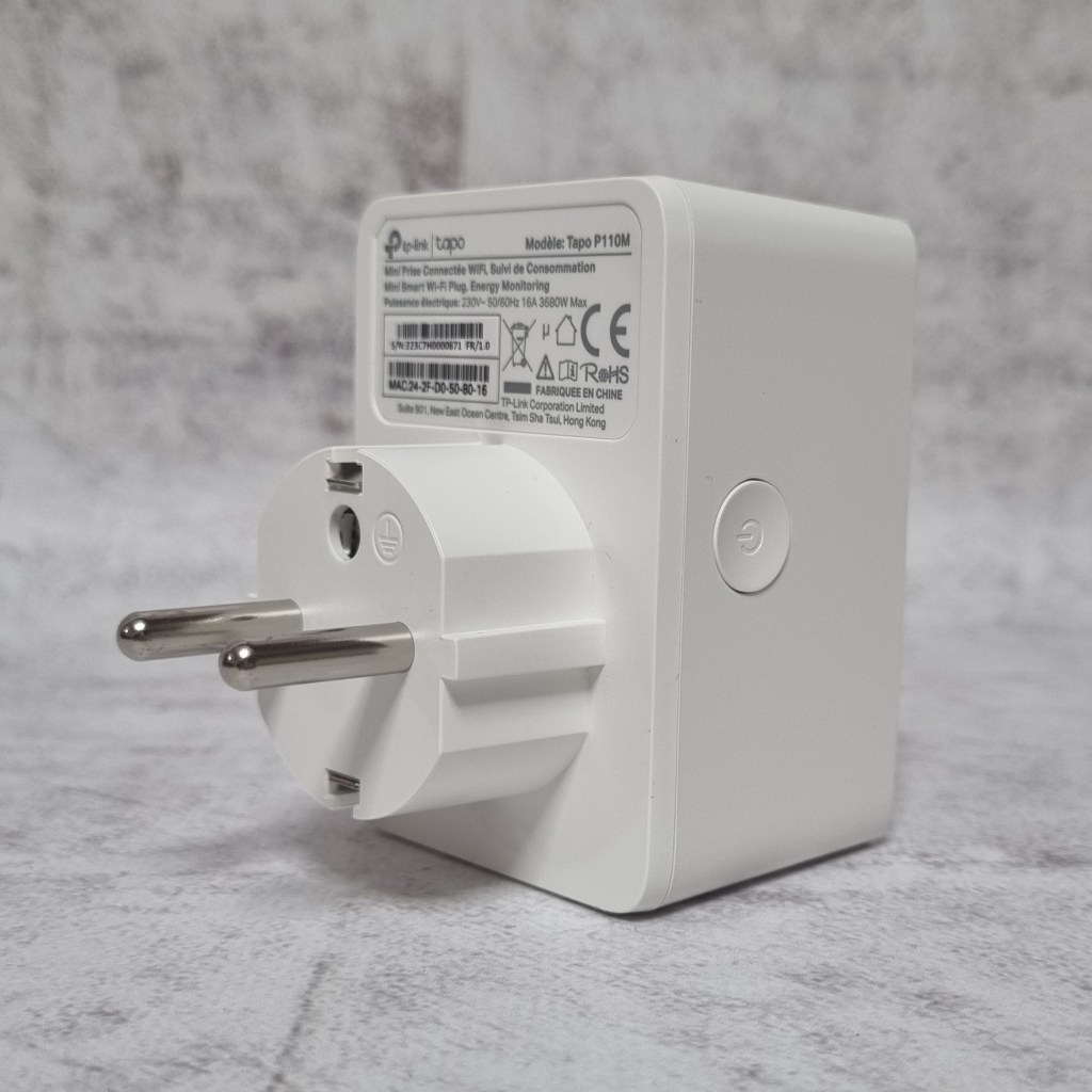 Tapo Mini Smart WiFi Plug with Energy Monitor model P110M z wtykiem E posiada dość duże wymiary w kształcie prostopadłościanu. Niestety kształt uniemożliwia swobodne korzystanie z gniazdek sąsiadujących np. w zasilaczu. Od frontu mamy logo Tapo i małą diodę LED. Świecąca na biało dioda oznacza włączone gniazdko. Z lewej strony znajdziemy przycisk sterowania, pozwalający zmieniać stan gniazdka, nie tylko z poziomu aplikacji. Na prawym boku znajdziemy przyklejony kod QR standardu Matter, niezbędny do dodania wtyczki. Parametry to zasilanie AC 220-240 V~50/60 Hz 10 A. Maksymalne obciążenie to 3680W/230V. 10A. Przy przełączaniu zasilania słychać charakterystyczny dźwięk, jest on porównywalny do konkurencji. Komunikacja odbywa się po protokole WiFi IEEE 802.11 b/g/n, 2,4 GHz, z zastosowaniem nowego standardu Matter. Protokół Bluetooth 4.2 używany jest tylko do konfiguracji. Do niej wymagany jest smartfon z systemem iOS 9.0 lub nowszym albo Androidem 4.3, lub nowszym. Wtyczka ma wymiary: wysokość 7,2 cm, szerokość 5,1 cm, głębokość 4 cm (bez wtyku), w całości 7,5 cm. Wtyczka dostępna jest jedynie w kolorze białym. Typ męskiej wtyczki to E i F, z drugiej strony zastosowano już tylko typ E. Dopuszczalna temperatura pracy: 0℃ -35℃, zaś dopuszczalna wilgotność powietrza: 10%-90% RH (bez kondensacji). Trzymaj urządzenie z dala od źródeł ciepła, takich jak kaloryfery, czy kuchenki. Urządzenie wykonane z materiałów ognioodpornych V-0 (UL94).