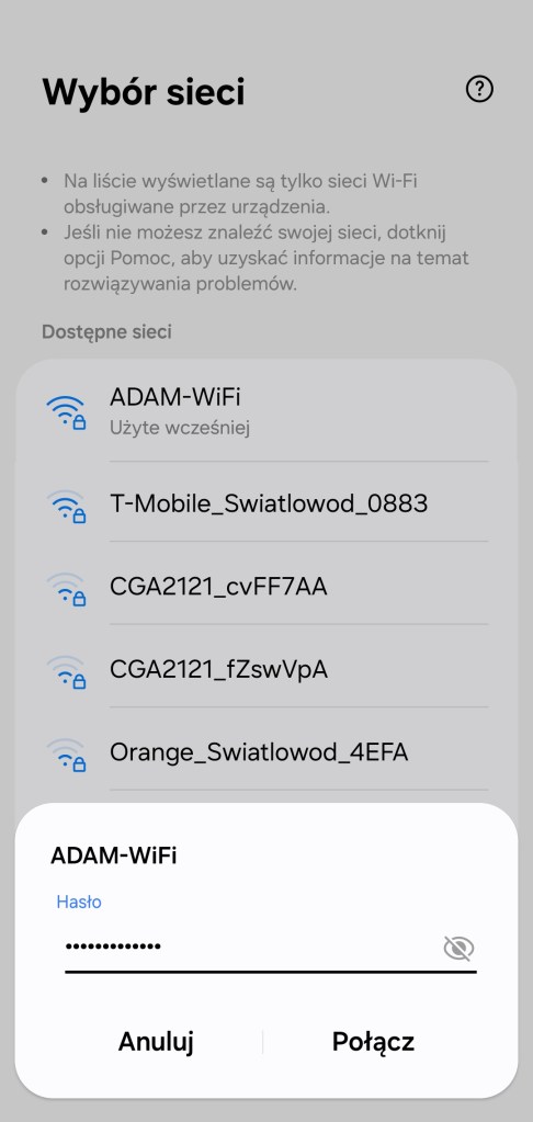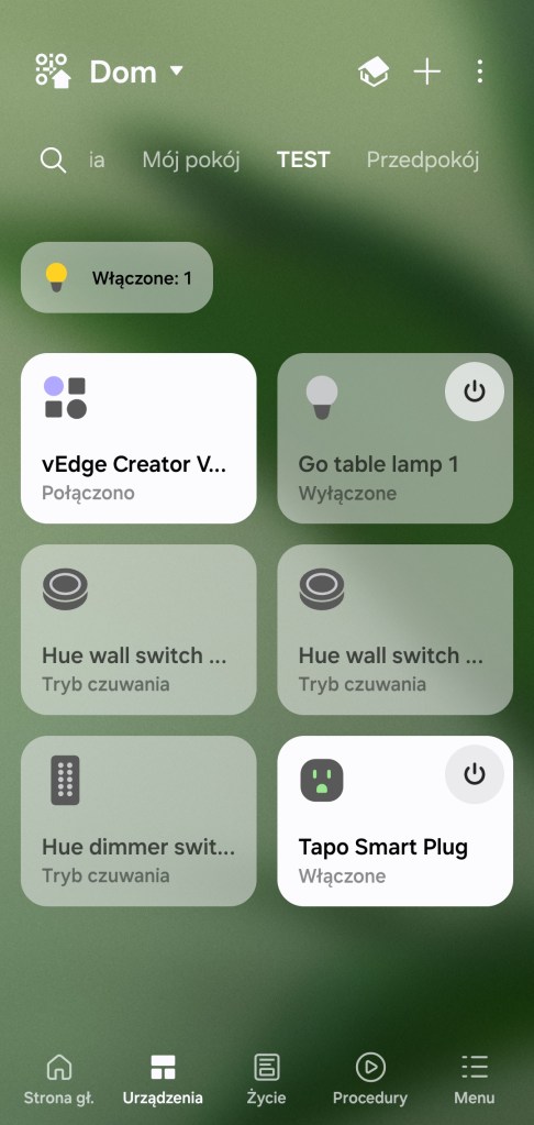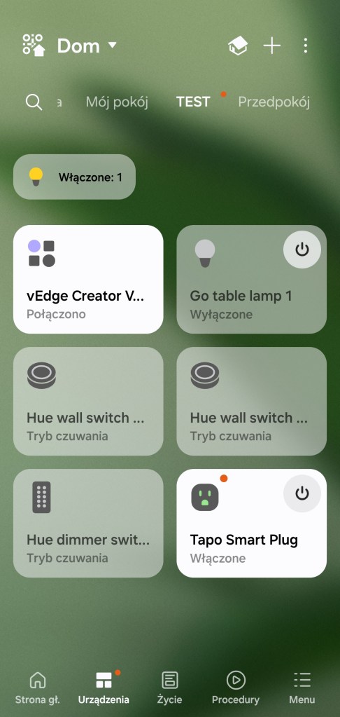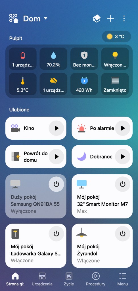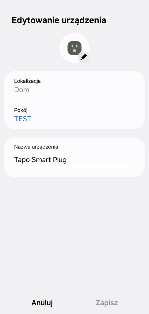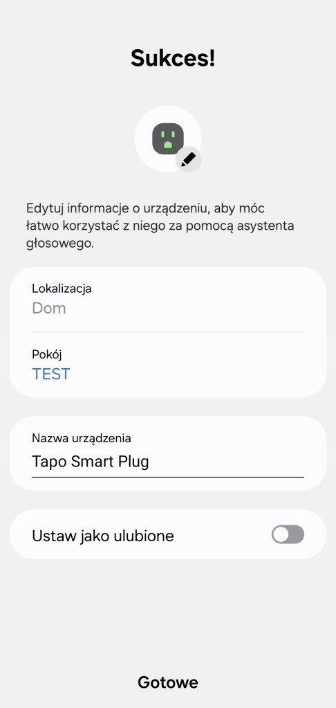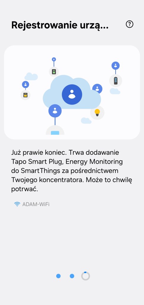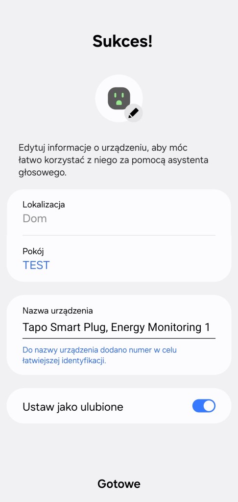 Dodanie do ekosystemu SmartThings jest niezwykle proste, wystarczy korzystać z polecań na ekranie. Przechodzimy do aplikacji SmartThings, na ekranie głównym aplikacji, klikamy Dodaj ( + ) znajdujący się w prawym górnym rogu ekranu, kolejno Dodaj urządzenie, następnie Skanuj kod QR. Zeskanuj kod, znajdziesz go na urządzeniu lub w opakowaniu. Uruchomi się proces konfiguracji. Następnie zostaniemy poproszeni o wybranie sieci Wi-Fi i wprowadzenie do niej hasła. Nastąpi rejestracja wtyczki Tapo na koncie Samsunga. Ostatni krok to nadanie nazwy, wybór pomieszczenia dla nowego urządzenia, ikony lub dodanie do panelu „Ulubione”. Zatwierdzamy zmiany, wybierając Gotowe, kończymy proces instalacji. Zostanie pobrany dodatek umożliwiający sterowanie i wyświetli się pokój ze smart wtyczką.