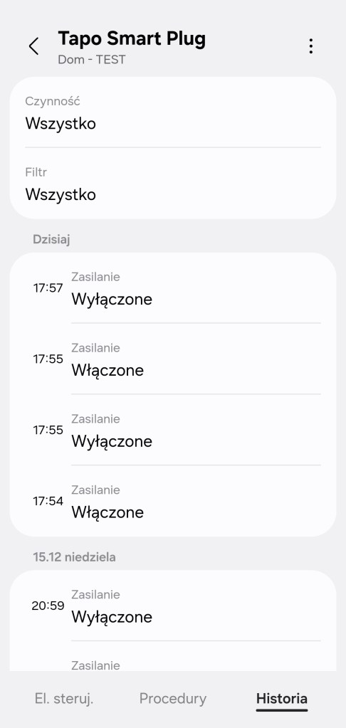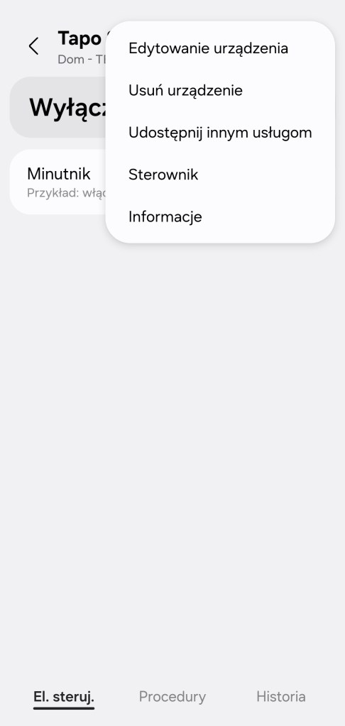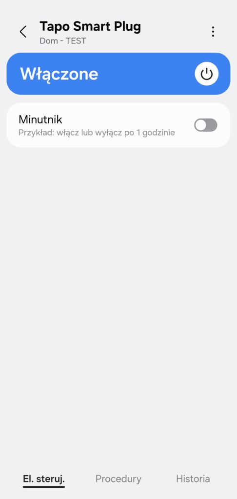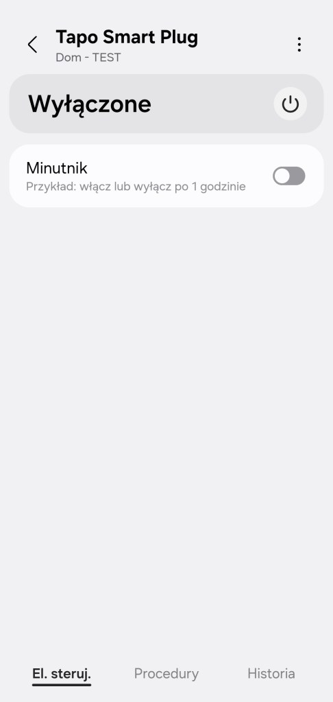 W głównym panelu sterowania urządzeniem mamy możliwość włączenia/wyłączenia gniazdka Tapo oraz możliwość ustawienia minutnika. Nie mamy informacji o zużyciu energii.Na dole znajdziemy sekcję panel „Procedury” znajdziemy tutaj szybkie procedury: włączenia i wyłączenia wtyczki o danej porze dnia oraz listę procedur, gdzie używane jest urządzenie. Panel „Historii” nie różni się znacznie od innych urządzeń, mamy dostęp do sortowania i przestudiowania historii działań gniazdka. W ustawieniach „Edytuj” mamy standardową możliwość zmiany nazwy, ikony, pokoju oraz możliwość dodania do panelu „Ulubione”.