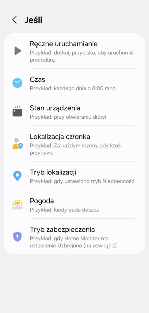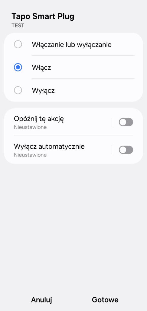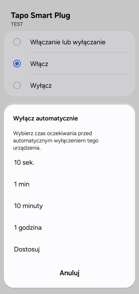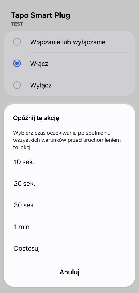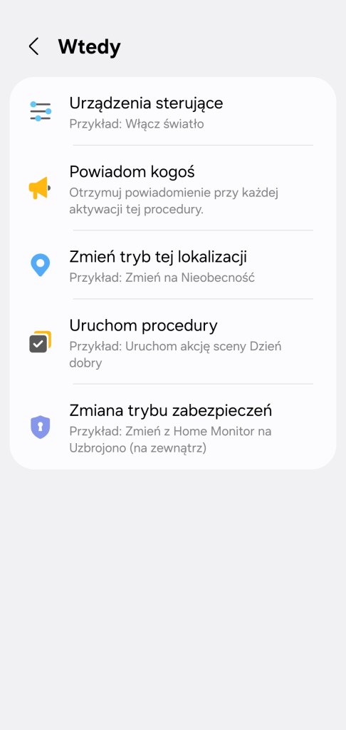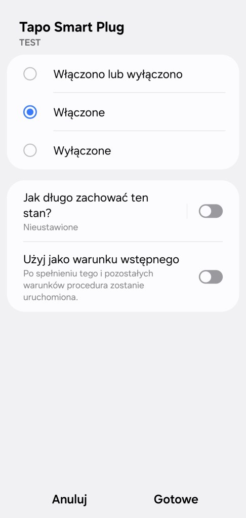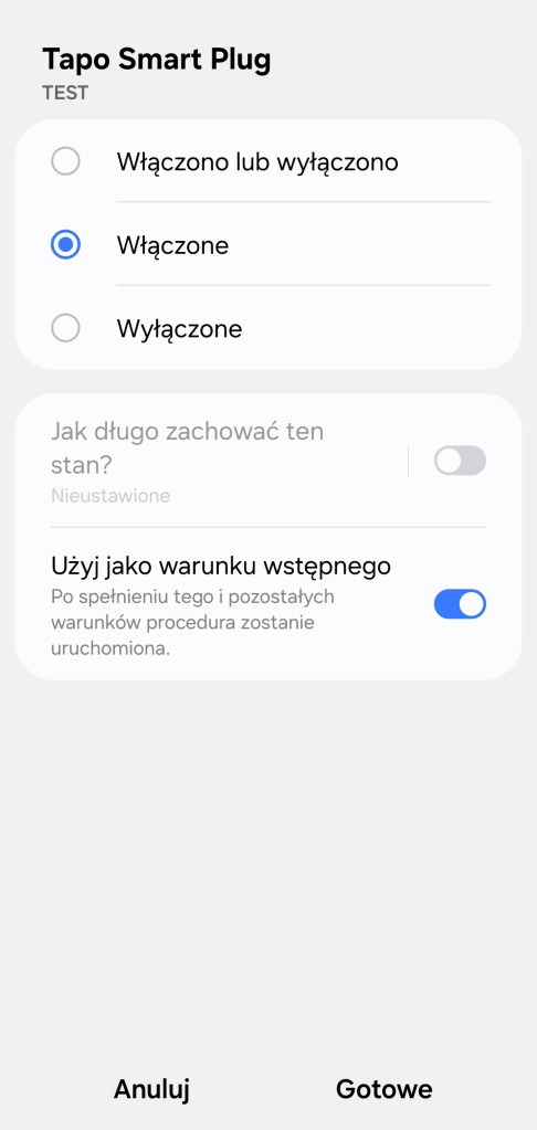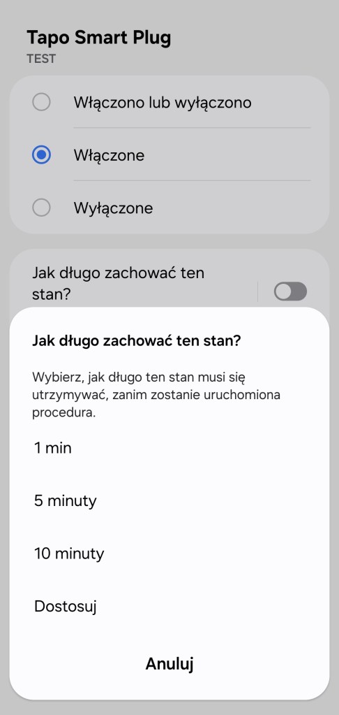 Tworzenie procedur (dawniej automatyzacje) „Jeśli … to Wtedy” musimy podzielić na dwa etapy, ponieważ znacznie różnią się dostępne opcje jeśli inicjujemy warunek „Jeśli” bądź „Wtedy”. W pierwszej możliwości „Jeśli” urządzenie pozwala na wybranie opcji „Włączono lub wyłączono”, czyli zmiana stanu, oraz „Włączone” i „Wyłączone”, gdzie możemy otrzymać powiadomienie, kiedy tylko ustalony zostanie zainicjowany. Posiadamy również możliwość ustawienia, jak długo dany stan ma trwać, zanim uruchomiona zostanie procedura. W drugiej możliwości „Wtedy”, mamy ponownie opcje „Włączono lub wyłączono” – przypomnijmy zmiana stanu, „Włączone” i „Wyłączone”. Dodatkowo akcję uruchomienia możemy opóźnić o dowolny czas, jak i wyłączyć automatycznie po ustalonym czasie.