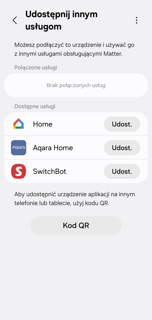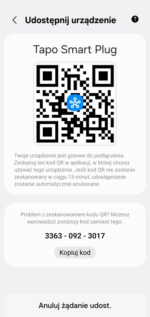 Jeśli chcemy udostępnić wtyczkę Tapo innej aplikacji obsługującej urządzenia spod szyldu Matter. Musimy zdobyć kod udostępniania. W aplikacji SmartThings znajdziemy go po wejściu w panel starowania, następnie Więcej opcji ( ⋮ ), dalej Udostępnij innym usługom. Na dole pojawi się Kod QR, kliknij go, a po chwili zostanie wygenerowany kod udostępniania. Możesz zeskanować kod QR inną aplikacją lub spisać kod i użyć go w innej aplikacji.