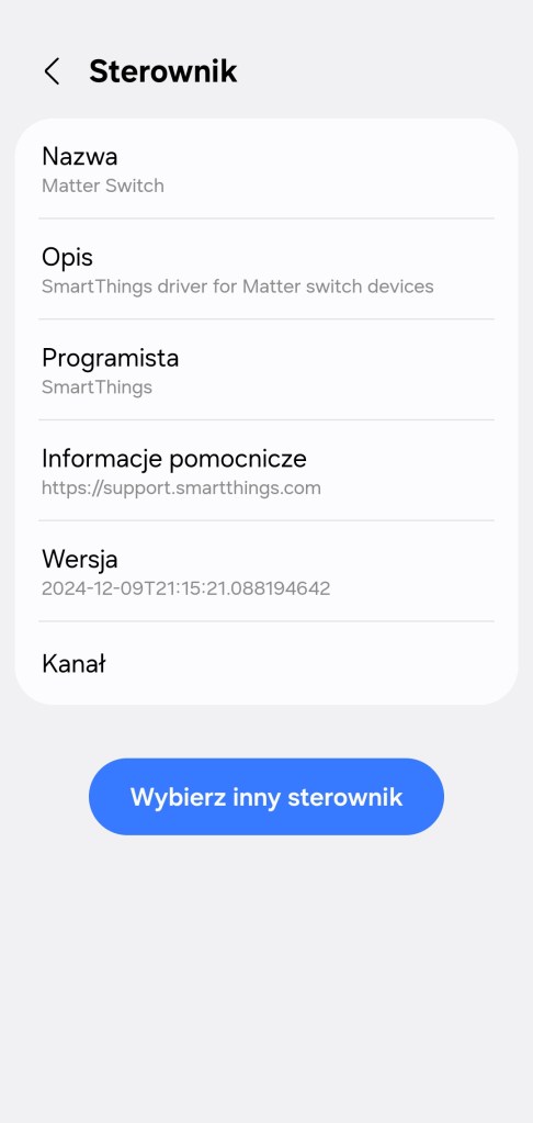 Do sterowania gniazdkiem Tapo używamy domyślnego sterownika SmartThings Edge dla przeznaczonego dla urządzeń z kategorii „Switch” z protokołem Matter. Sterownik to Matter Switch autorstwa programistów SmartThings.