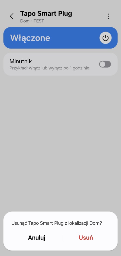 Aby usunąć gniazdko Tapo z ekosystemu SmartThings, należy wejść w główny ekran urządzenia. Kliknąć Więcej opcji ( ⋮ ) i wybrać z menu Usuń urządzenie. Następnie potwierdzamy operację, stukając Usuń.