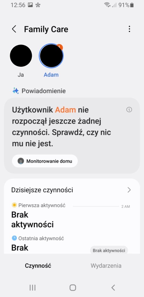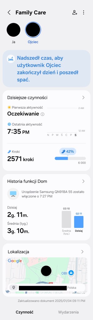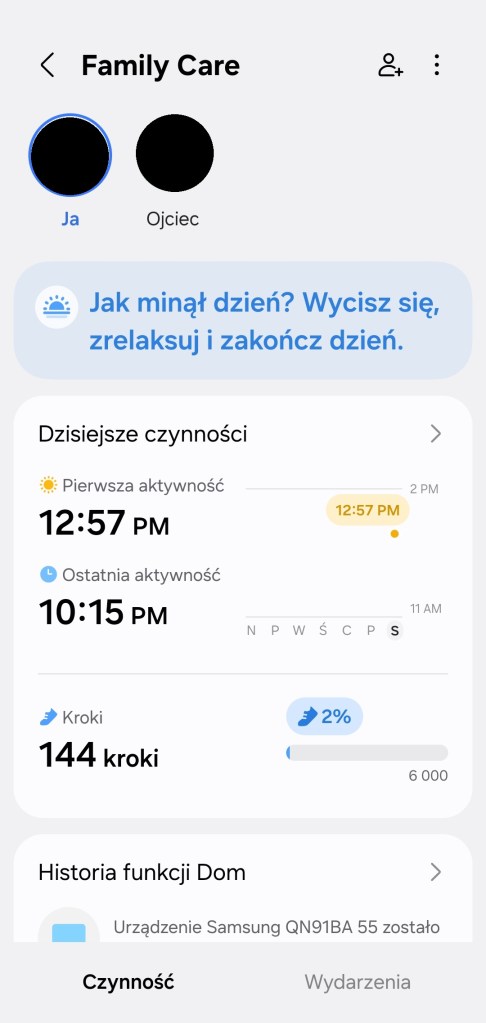 Na głównym ekranie Family Care widzimy podsumowanie dzisiejszych aktywności domownika, historie aktywności w SmartHome oraz ostatnią zarejestrowaną lokalizację. Możemy przejrzeć dokładnie godzinę pierwszej i ostatniej aktywności, podejrzeć ilość zrobionych kroków oraz ile dzisiaj czasu zostało spędzone przy aktywności na telefonie. Historia funkcji pozwala nam porównać, jak bardzo nasz np. senior był aktywny w domu: ile czasu oglądana była telewizja, otwierana szafka na leki, otwierane drzwi balkonowe, czy słuchana muzyka.