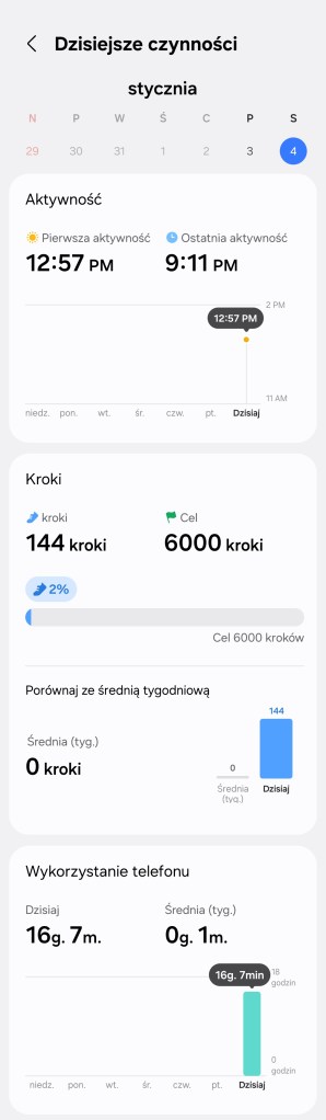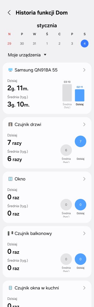 Możemy przejrzeć dokładnie godzinę pierwszej i ostatniej aktywności, podejrzeć ilość zrobionych kroków oraz ile dzisiaj czasu zostało spędzone przy aktywności na telefonie. Historia funkcji pozwala nam porównać, jak bardzo nasz np. senior był aktywny w domu: ile czasu oglądana była telewizja, otwierana szafka na leki, otwierane drzwi balkonowe, czy słuchana muzyka.