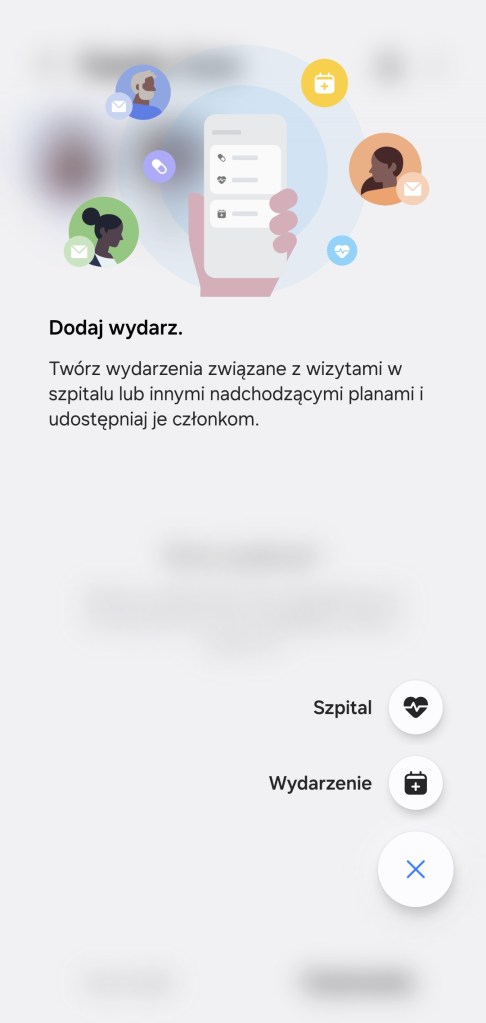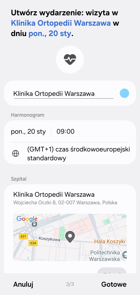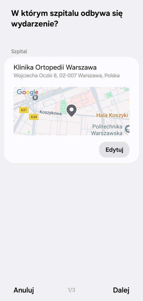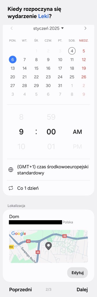 Poniższe screeny prezentują tworzenie wydarzenia związanego z pójściem do szpitala oraz wydarzenie czyt. przypomnienie o wzięciu leków o 9:00. Wydarzenia mogą być cykliczne i się powtarzać o konkretnej częstotliwości. Możemy określać lokalizacje, gdzie członek rodziny ma się znajdować, aby móc wykonać daną czynność np. zmierzyć ciśnienie krwi.
