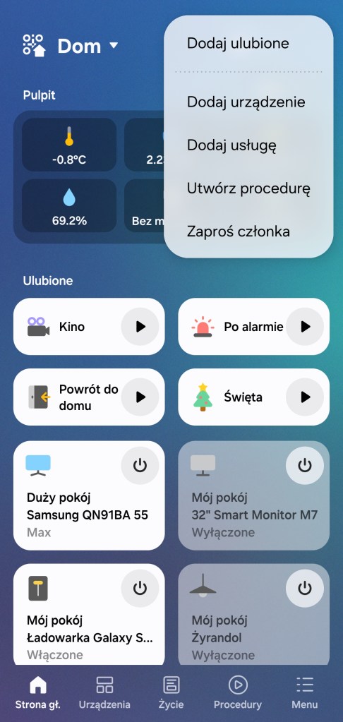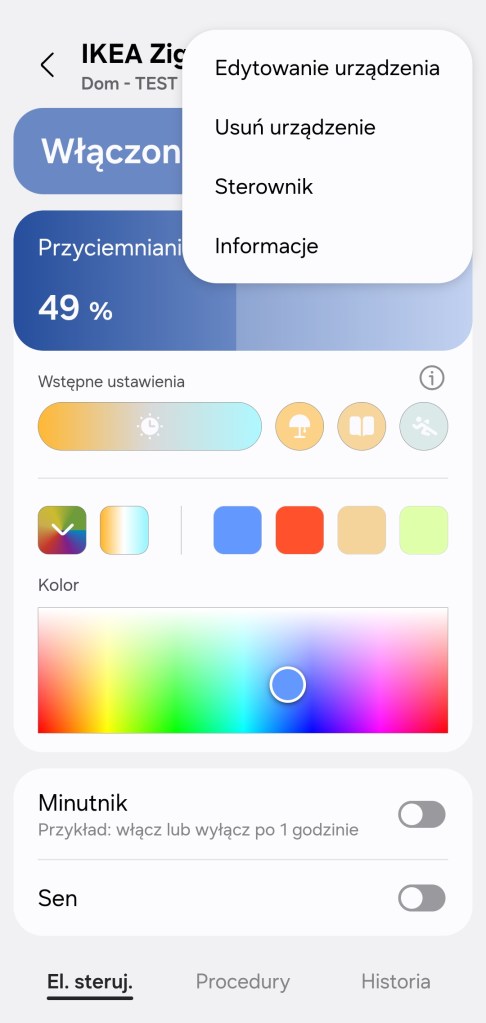 Na dole znajdziemy sekcję panel „Procedury”, znajdziemy tutaj szybkie procedury: włączenia i wyłączenia żarówki o danej porze dnia oraz listę procedur, gdzie używane jest urządzenie. Panel „Historii” nie różni się znacznie od innych urządzeń, mamy dostęp do sortowania i przestudiowania historii działań żarówki. W ustawieniach „Edytuj” mamy standardową możliwość zmiany nazwy, ikony, lokalizacji, pokoju oraz możliwość dodania do panelu „Ulubione”.