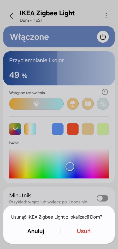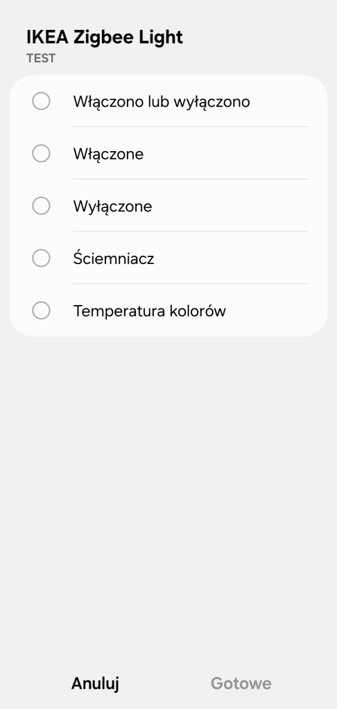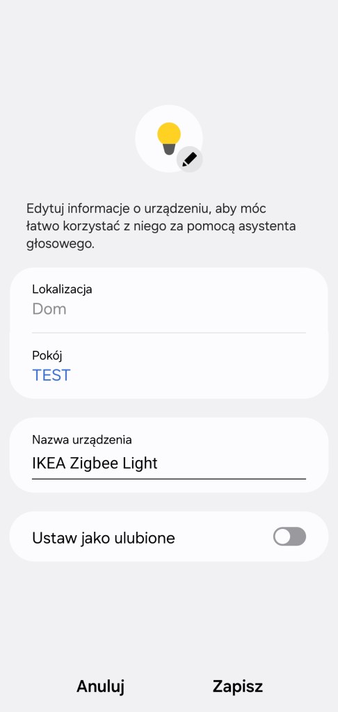 Dodanie do ekosystemu jest proste należy postępować zgodnie z instrukcją w aplikacji SmartThings. Klikamy na ekranie głównym przycisk Dodaj ( + ), w prawym górnym rogu ekranu. Następnie Dodaj urządzenie, przesuwamy w dół do sekcji marek Wybór z listy urządzeń, wybieramy markę IKEA. Nie mamy dodanego kodu QR do urządzenia, więc wybierz opcje Dodaj bez kodu QR. Po chwili cierpliwości (do około 1 minuty), nowa żarówka zostanie automatycznie dodana do platformy SmartThings. Klikając Edytuj, możemy zmienić jej ikonę, pomieszczenie oraz nazwę. My zmieniliśmy ją na IKEA Zigbee Light, klikamy Zapisz. Kończmy proces instalacji, wybierając Gotowe. Żarówka IKEA pojawi się w wybranym pokoju i jest gotowa do użytku.