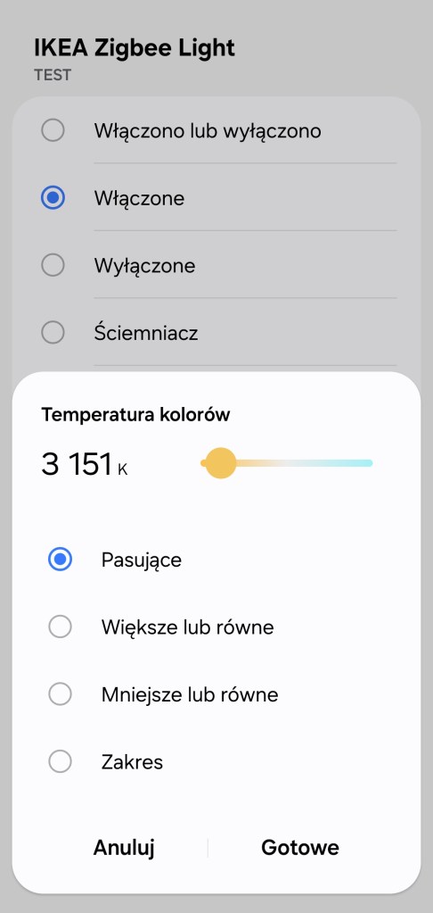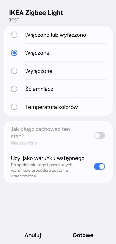 Tworzenie procedur (dawniej automatyzacje) „Jeśli … to Wtedy” musimy podzielić na dwa etapy, ponieważ znacznie różnią się dostępne opcje. W pierwszej możliwości „Jeśli” urządzenie pozwala na wybranie opcji „Włączono lub wyłączono”, czyli zmiana stanu, bądź „Włączone” i „Wyłączone”. Poniżej mamy wartość ściemniacza 1 – 100% i temperatury kolorów z zakresu 2000 – 6500 K. Możemy ustawić również zakres tych wartości. Dodatkowo mamy opcję, jak długo zachowany powinien być stan przed uruchomieniem procedury oraz, czy ma być to warunek wstępny.