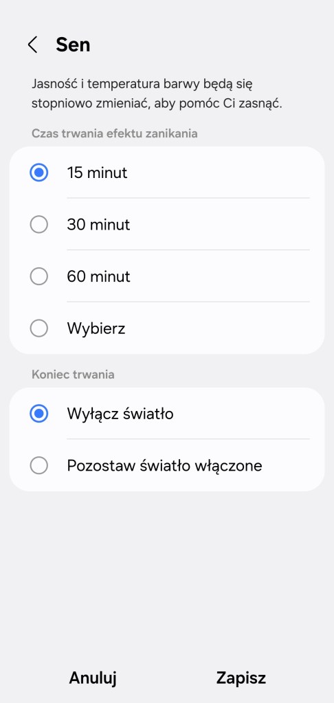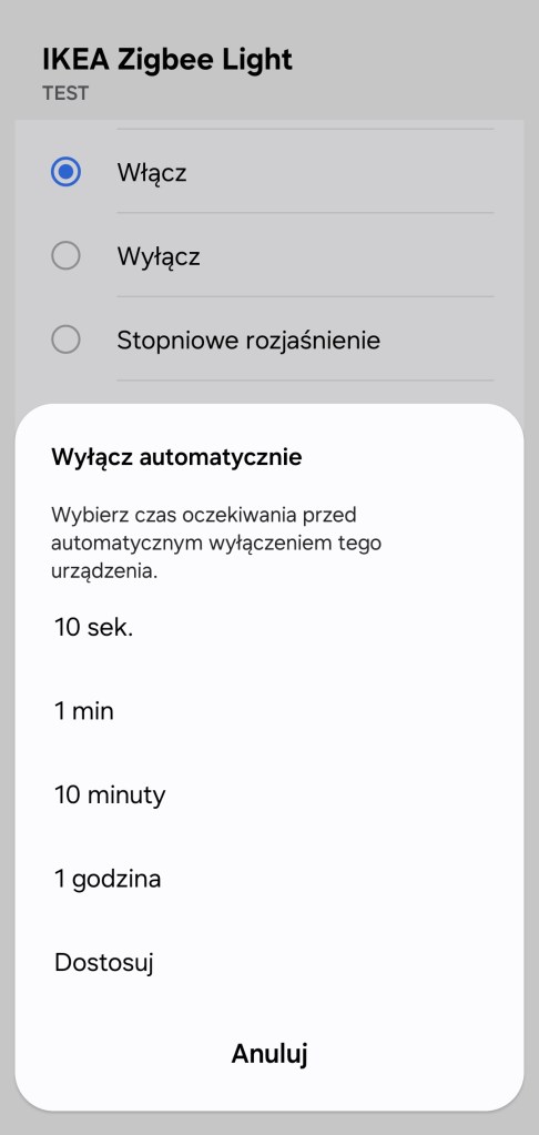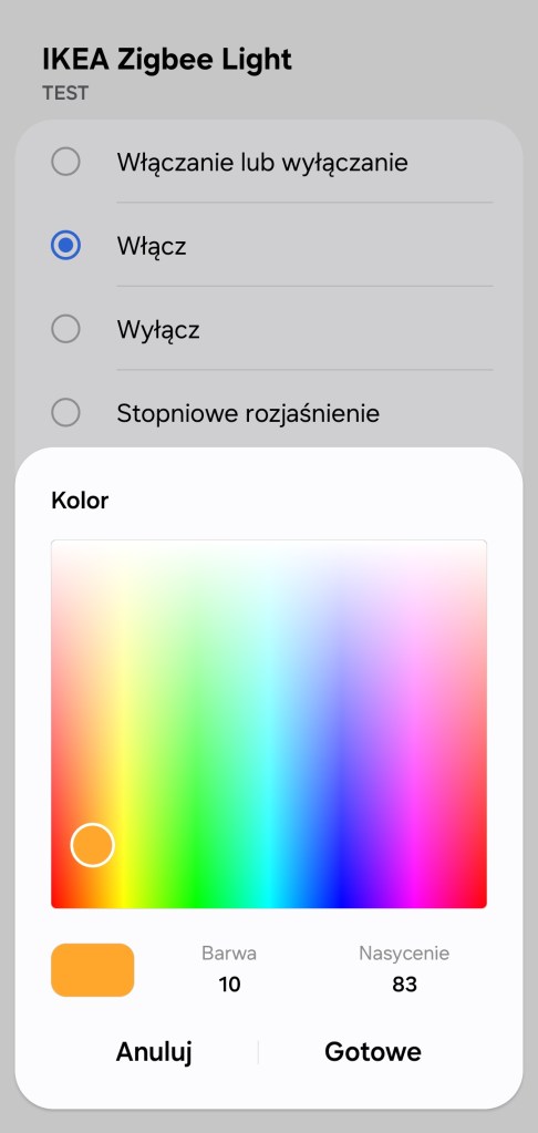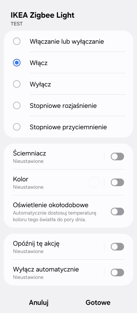 W drugiej możliwości „Wtedy” lampa pozwala odmienne aktywacje, mamy pełną kontrolę opcji przydatnych w tworzeniu np. scenerii. I tak mamy ponownie opcje „Włączono lub wyłączono” oraz „Włączone” i „Wyłączone”. Ustawienie jednego z palety kolorów i jasności lampy w zakresie 0 – 100%, dodatkowo możemy określić temperaturę barwową. Akcję uruchomienia światła możemy opóźnić o dowolny czas, jak i wyłączyć ją automatycznie po ustalonym czasie. Mamy możliwość uruchomienia oświetlenia okołodobowego, czyli takiego, które dostosowuje się do obecnej pory dnia (w dzień jasna barwa / w nocy ciepła barwa światła).