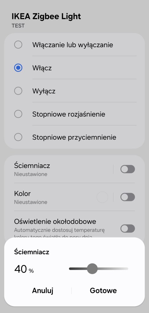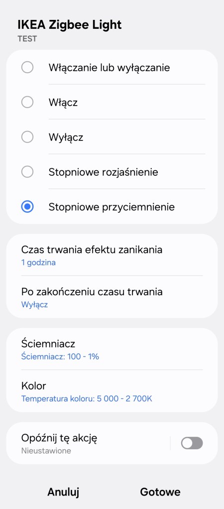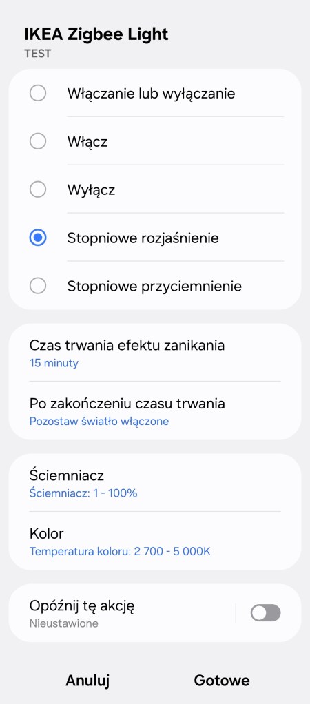 W opcjach warunku „Wtedy” widzimy dwie nowe opcje są to stopniowe rozjaśnianie i przyciemnianie. Te dwie opcje pozwalają określić czas, końcowy efekt, zakres od jakiego rozpoczynamy i kończymy stopniowanie ściemniacza oraz kolor podczas całego dynamicznego efektu oświetlenia. Tym samym zależnie od potrzeb oświetlenie może stopniowo nas rano obudzić – rozjaśniając się stopniowo przed pracą. A na koniec dnia pomóc nam zasnąć – przyciemniając się stopniowo i na końcu wyłączając.