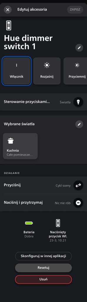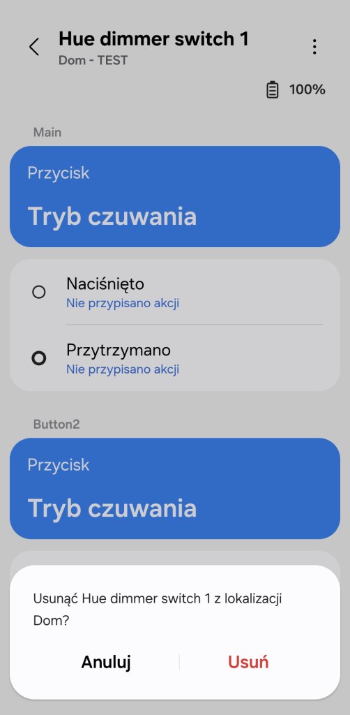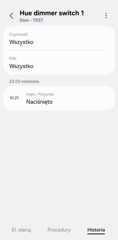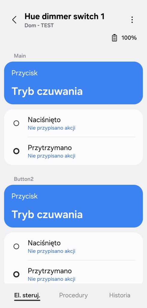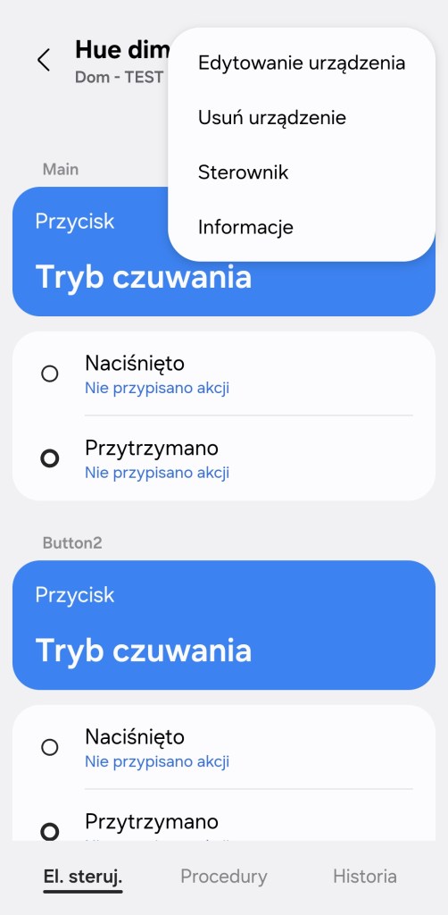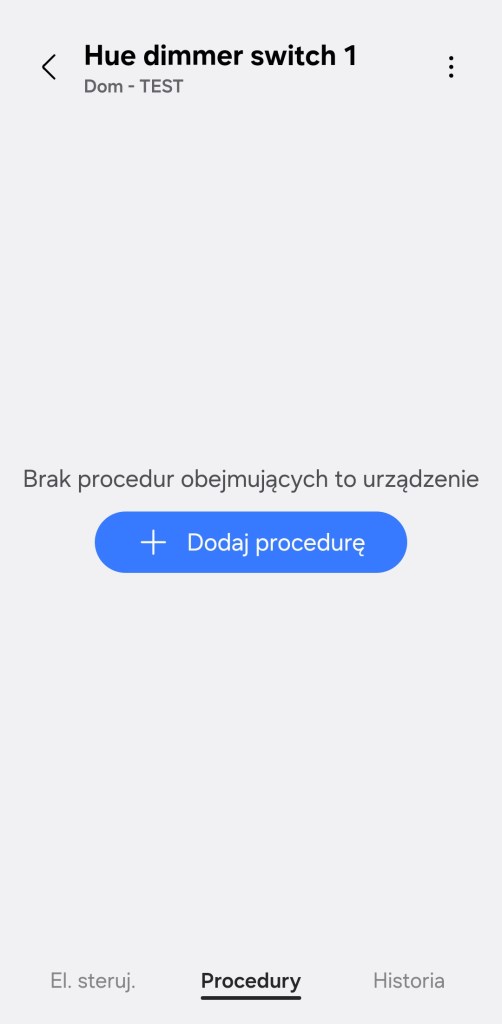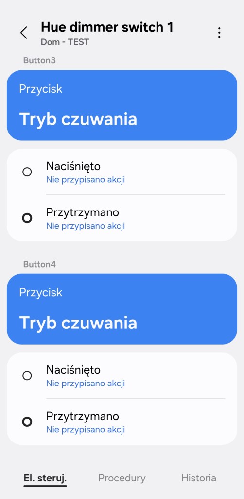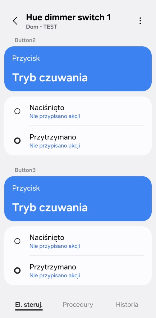 W głównym panelu mamy cztery przyciski oznaczone jako „Main” oraz „Button 2-4” są to kolejno: włącznik/wyłącznik, 2 – rozjaśnianie, 3 – ściemnianie, 4 – logo Hue. W każdym możemy podpiąć automatyzację wywoływaną poprzez naciśnięcie lub przytrzymanie. Na górze znajdziemy małe logo baterii informujące o jej poziomie. Na dole znajdziemy sekcję „Procedury” znajdziemy tutaj listę wszystkich automatyzacji, gdzie używany jest pilot. Panel „Historii” nie różni się znacznie od innych urządzeń, mamy dostęp do sortowania i przestudiowania historii wywoływania akcji. W ustawieniach „Edytuj” mamy standardową możliwość zmiany nazwy i pomieszczenia.