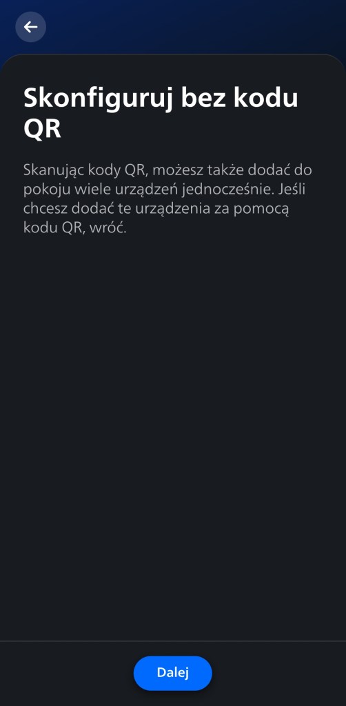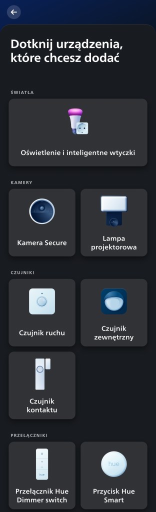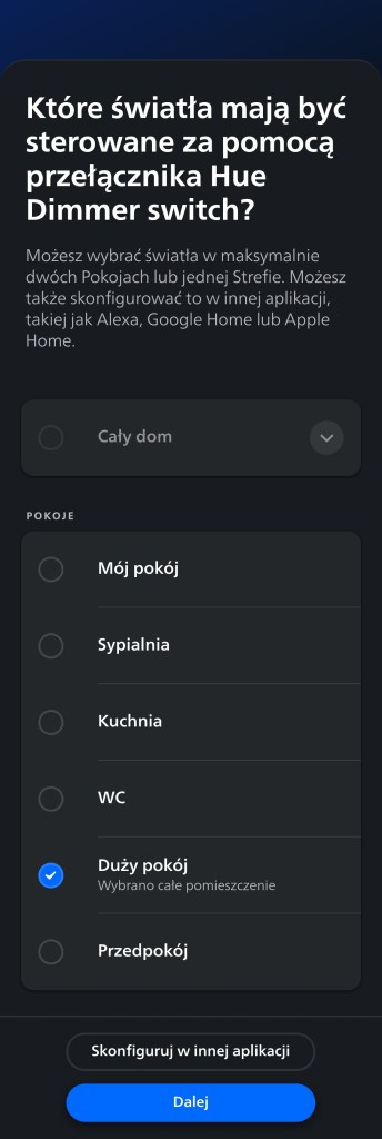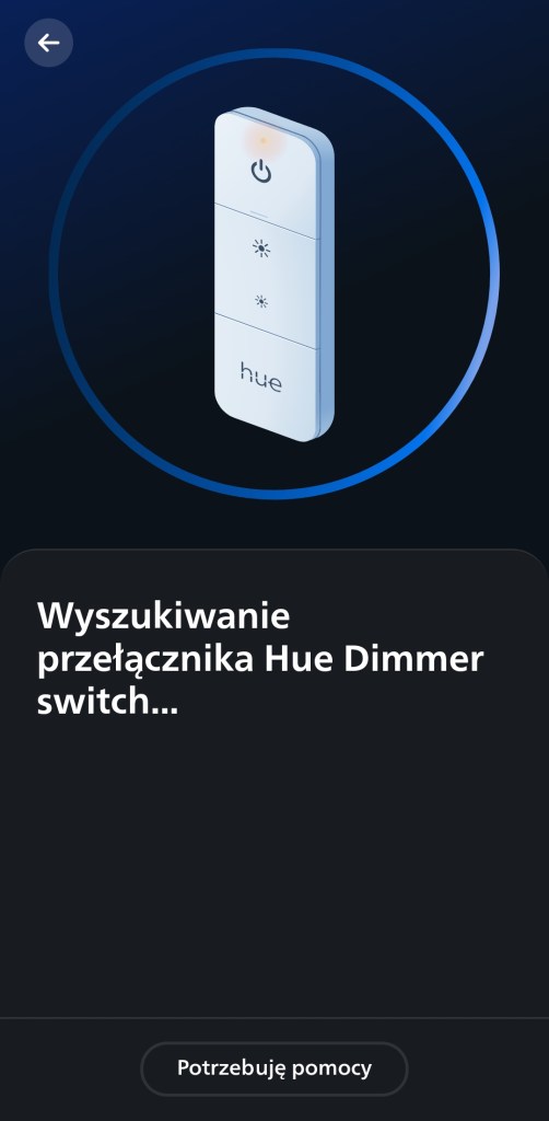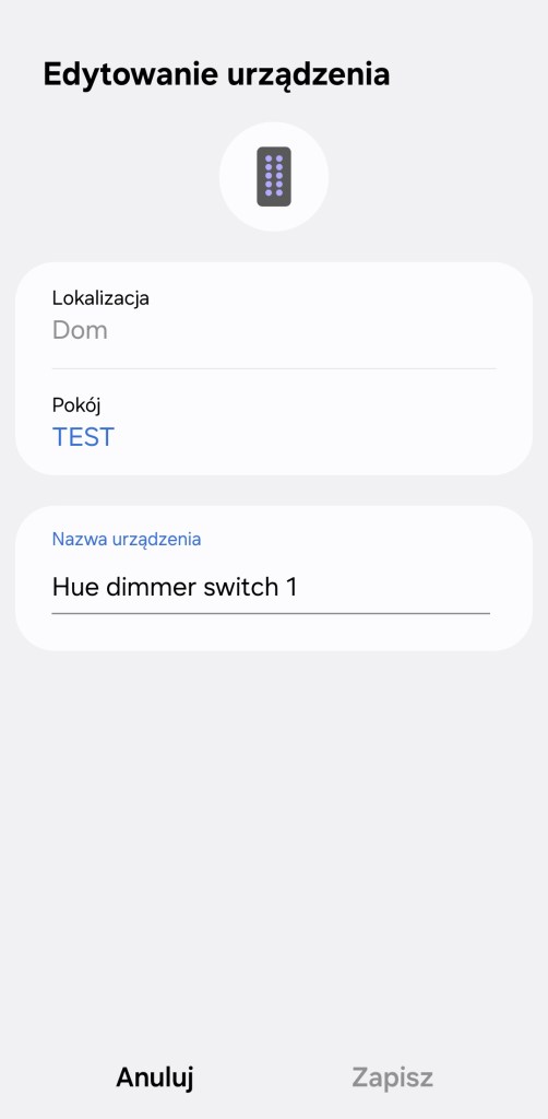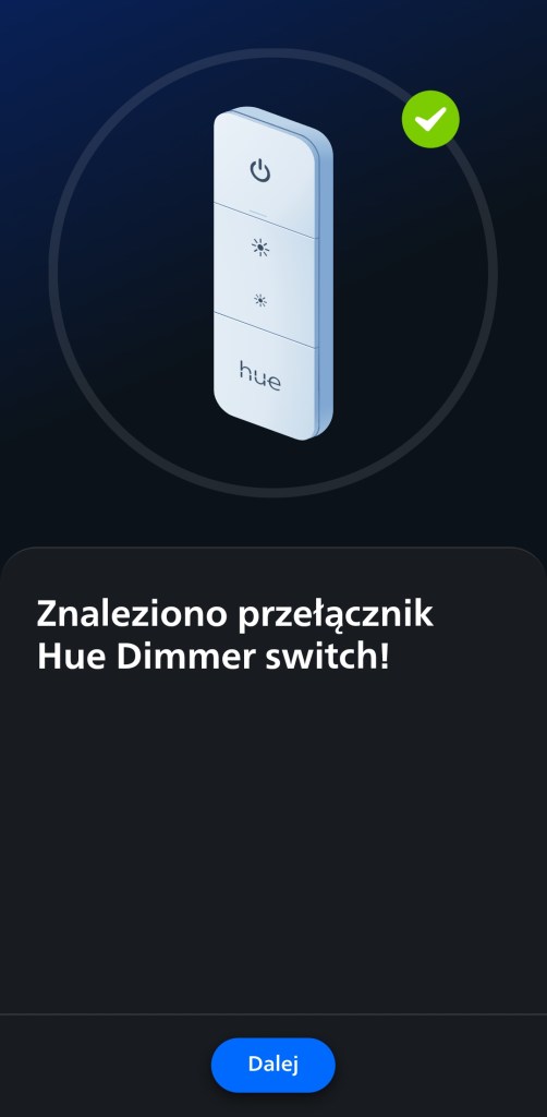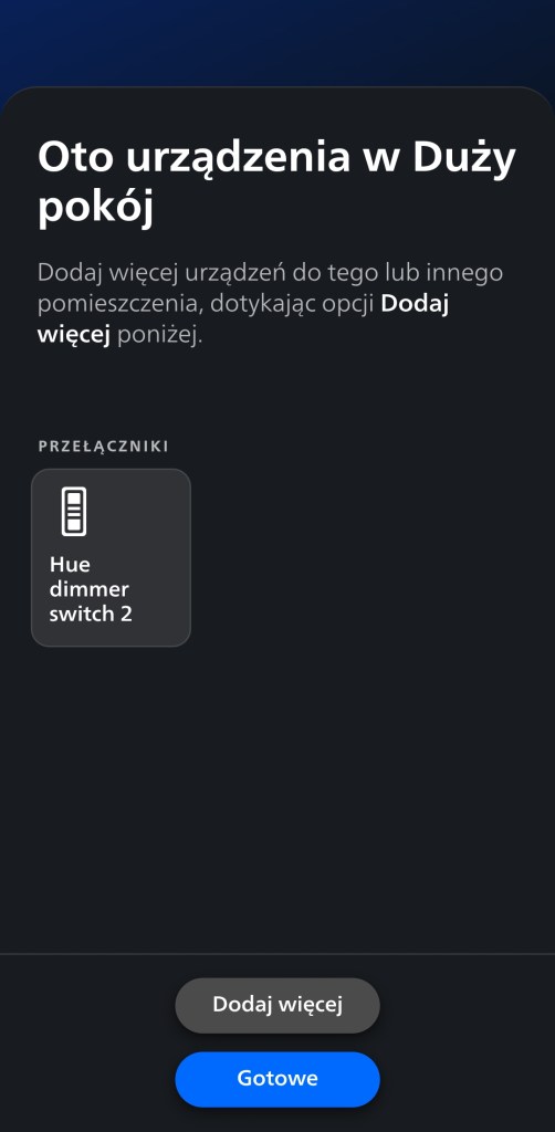Zdecydowanie bardziej polecamy drugą opcję wykorzystującą mostek Hue i centralę SmartThings. Łatwiejsza opcja i bardziej stabilna. W pierwszej kolejności musimy połączyć nowy pilot z mostkiem i aplikacją Philips Hue. W tym celu musimy pobrać aplikację z Google Store (Android 10 lub nowszy), bądź AppStore (iOS 15.0 lub nowszy). Po zainstalowaniu aplikacji uruchamiamy ją. Aby wyszukać nowe urządzenia, musimy przejść do Ustawienia aplikacji, klikamy w prawym dolny róg ekranu. Z dostępnych opcji, kliknij Urządzenia, następnie plus ( + ) znajdujący się w prawym górnym rogu. Wybierz pokój, w którym ma znajdować się urządzenie. Możemy go dodać poprzez wpisanie numeru seryjnego, kliknij Zeskanuj kod QR lub poprzez wyszukanie. Wybraliśmy drugą opcję, klikamy Bez kodu QR. Z listy wybierz model naszego pilota. Naciśnij i przytrzymaj przez 3 sekundy przycisk włączania. Po chwili pilot zostanie wykryty, nadajemy mu nazwę lub pozostawiamy domyślną i zatwierdzamy, klikając Zapisz. Kończymy proces instalacji, wybierając Gotowe. Na ekranie pojawi się komunikat o prawidłowym dodaniu urządzenia.