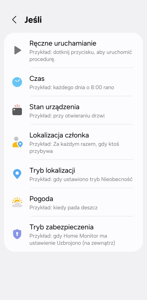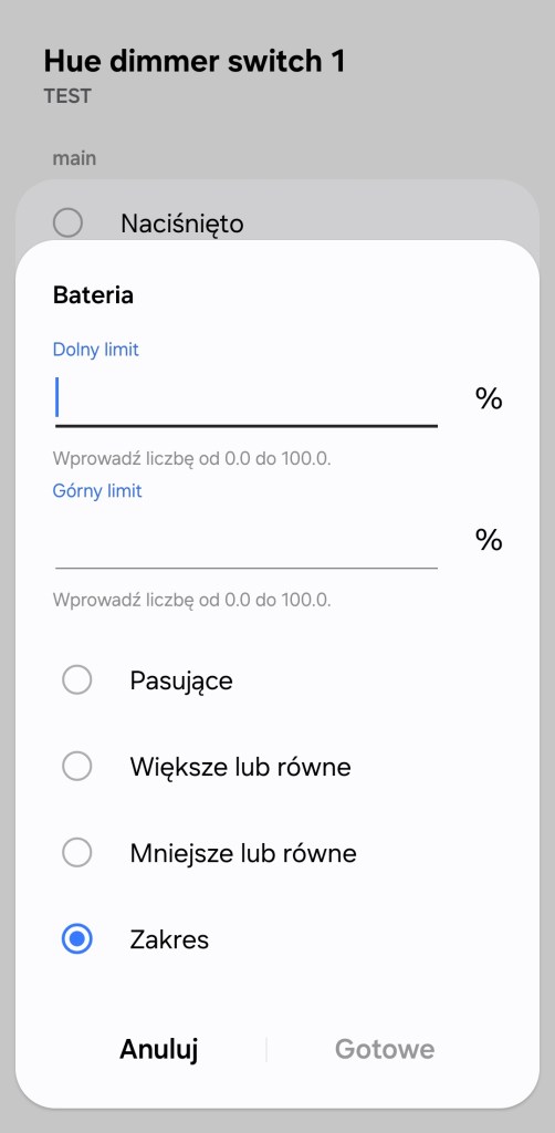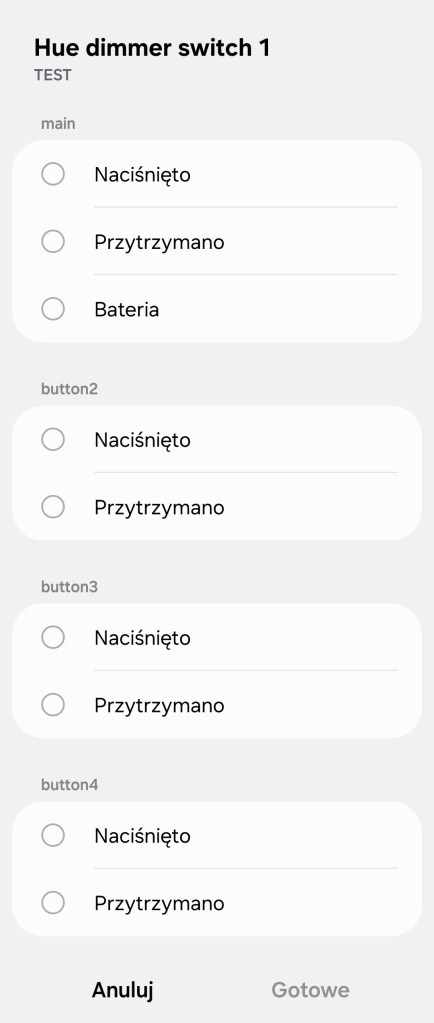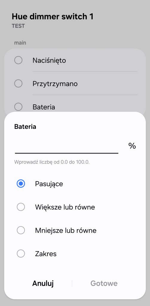 Przy tworzeniu procedur „Jeśli … to Wtedy”, ze względu na specyfikę urządzenia mamy do wyboru tylko opcję „Jeśli”. Przy tworzeniu procedury „Jeśli” mamy dostęp do jednego z czterech przycisków z możliwością uruchomienia akcji po naciśnięciu lub przytrzymaniu. Ostatnia informacja to stan baterii z zakresu od 0 do 100% w tym, czy jest większa/mniejsza lub w określonym zakresie.
