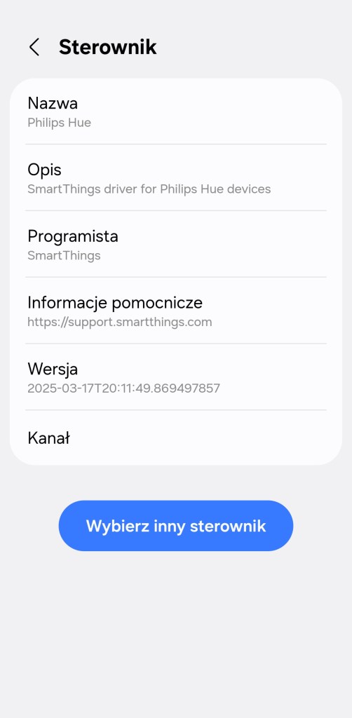 Jeśli podczas instalacji pilot Philips Hue wybierze inny sterownik Edge z mniej funkcjonalnymi opcjami, w każdej chwili można go zmienić na domyślny. Aby zmienić sterownik Edge, należy wejść panel urządzenia. Następnie klikamy Więcej opcji ( ⋮ ), z listy wybieramy Sterownik i Wybierz inny sterownik. Z listy dostępnych wybierz ten, który najlepiej Ci odpowiada oraz posiada rozbudowane funkcje, których chcesz użyć. Ja polecam używać sterownika domyślnego. Poniżej screen.