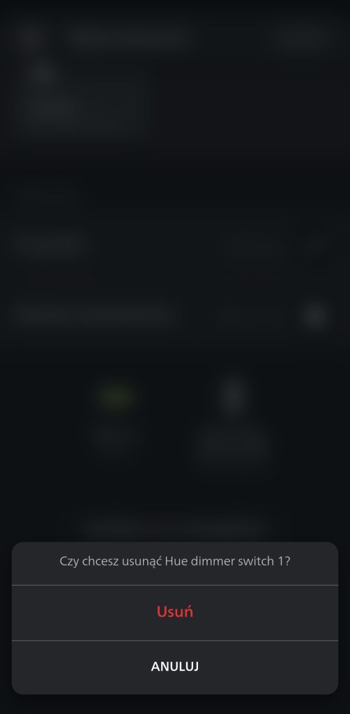 Aby uniknąć ponownego wyszukania urządzenia przez aplikację SmartThings, należy również usunąć ściemniacz z aplikacji Philips Hue. W tym celu otwieramy aplikację Hue, przechodzimy do Ustawienia (prawy dolny róg). Następnie z dostępnych opcji wybierz Światła. Na liście świateł Hue wyszukujemy konkretny reflektor, aby upewnić się, że usuwamy odpowiednią żarówkę, możemy kliknąć jego nazwę, a mrugnie nam światłem. Aby usunąć, wybieramy Usuń i potwierdzamy, klikając ponownie Usuń światło.