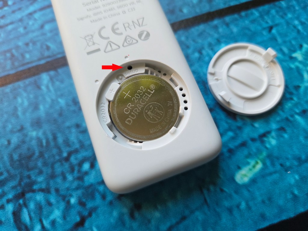 Aby zresetować i przywrócić do ustawień fabrycznych Philips Hue Dimmer switch, należy nacisnąć i przytrzymać (ok. 15 sekund) jednocześnie wszystkie cztery przyciski. Puść je, kiedy przednia dioda LED zacznie migać na przemian na czerwono i zielono. Dodatkowo można wykonać tzw. „twardy reset” przełącznika Hue Dimmer switch, naciskając i przytrzymując przez 10 sekund przycisk konfiguracji SETUP z tyłu urządzenia. Znajduje się pod pokrywą baterii.