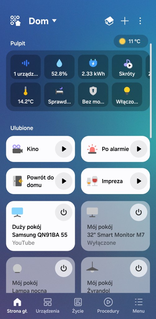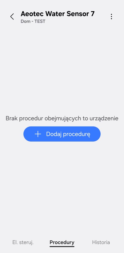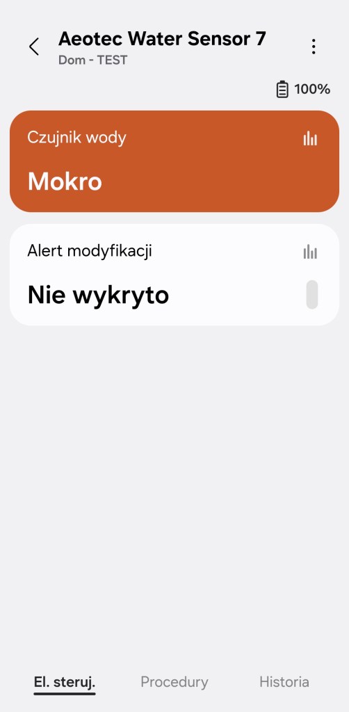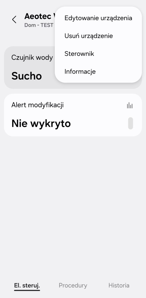 W głównym panelu aplikacji mamy informację czy czujnik zalania wykrył wodę „Sucho”/”Mokro”. U góry znajdziemy procentową informację o stanie baterii. Dostajemy dodatkową informację dotyczącą alertu modyfikacji sensora. Na dole znajdziemy sekcję panel „Procedury”, a w niej listę procedur, gdzie używany jest sensor. Panel „Historii” nie różni się znacznie od innych urządzeń. Mamy dostęp do sortowania i przestudiowania historii działań czujnika. W ustawieniach „Edytuj” mamy standardową możliwość zmiany nazwy, pokoju oraz możliwość dodania do panelu „Ulubione”.
