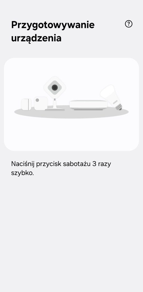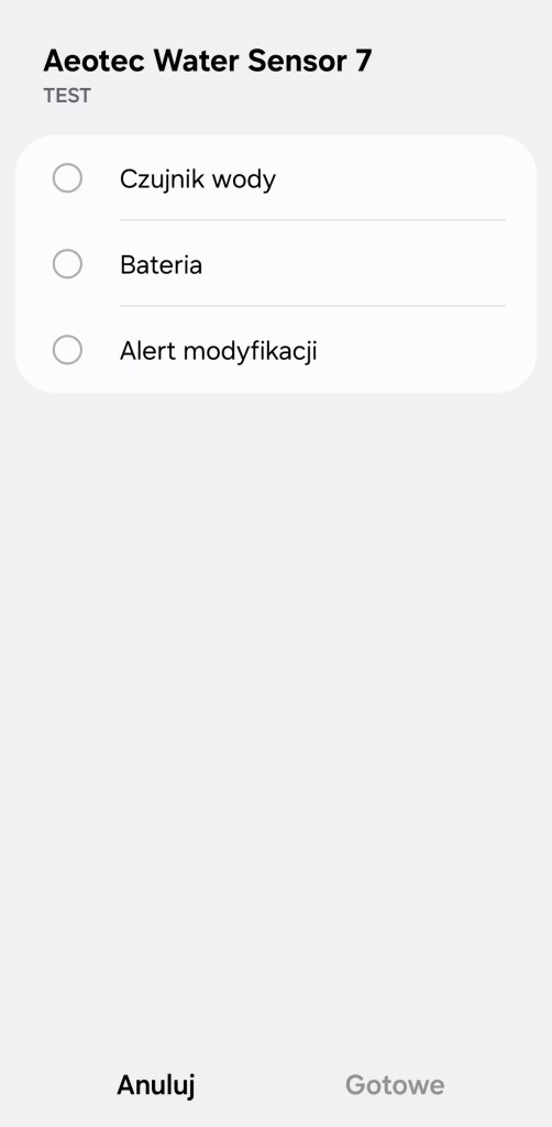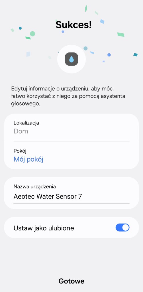 Dodanie do ekosystemu jest proste, należy postępować zgodnie z instrukcją w aplikacji. Na ekranie głównym aplikacji klikamy Dodaj ( + ), w prawym górnym rogu ekranu. Następnie Dodaj urządzenie, kliknij Dodaj w sekcji Urządzenia partnerów, z długiej listy wybieramy markę Aeotec. Dalej klikamy Czujnik przeciekania wody. Zostaniemy poproszeni o wybór konkretnego modelu, w naszym wypadku jest to Water Sensor 7. Otwórz obudowę i usuń kartkę, zabezpieczającą baterię. Kliknij trzykrotnie przycisk antysabotażowy, znajdzie go pod zdjętą obudową urządzenia. Jest to mała czarna wypustka z boku urządzenia. Zostaniemy poproszeni o zeskanowanie kodu QR znajdującego się na urządzeniu, klikamy Dalej. Kod QR możemy też wprowadzić ręcznie. Dioda LED zacznie migać na czerwono i zielono, w czasie próby połączenia z ekosystemem. Na koniec pojawi się komunikat o pomyślnym dodaniu sensora do inteligentnego domu. Możemy zmienić nazwę, pokój, dodać do listy „Ulubionych. Kończąc instalację, klikamy Gotowe.