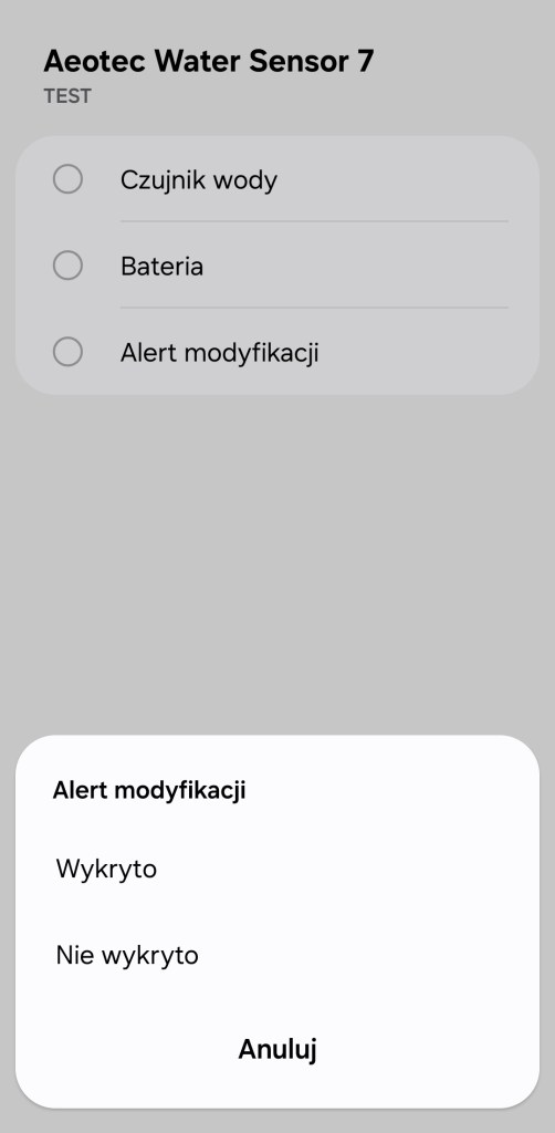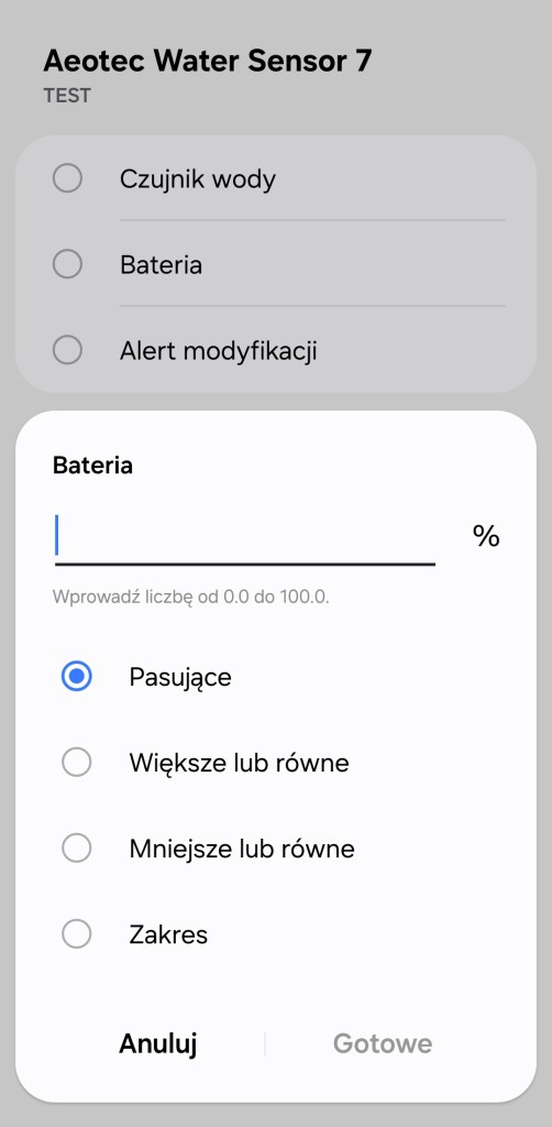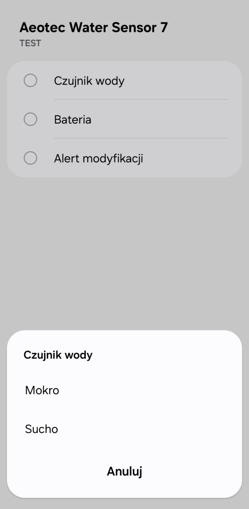 Przy tworzeniu procedur „Jeśli … to Wtedy”, ze względu na specyfikę urządzenia, możliwe jest tylko wykorzystanie warunku „jeśli”. Sensor pozwala na wybranie stanu czujnika wody „Mokro”/”Sucho”. Powiadomić nas może o alercie modyfikacji oraz o poziomie baterii z zakresu 0 – 100% w tym, czy są większe/mniejsze niż podana.