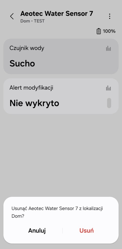 Aby usunąć sensor Aeotec z ekosystemu SmartThings, należy wejść w główny ekran urządzenia. Kliknąć Więcej opcji ( ⋮ ) w prawym górnym rogu ekranu, a następnie Usuń urządzenie. Następnie potwierdzamy operację, stukając Usuń. Pamiętaj, że usunięcie z aplikacji skutkuje również wyczyszczeniem urządzenia z wszelkich przypisanych procedur.