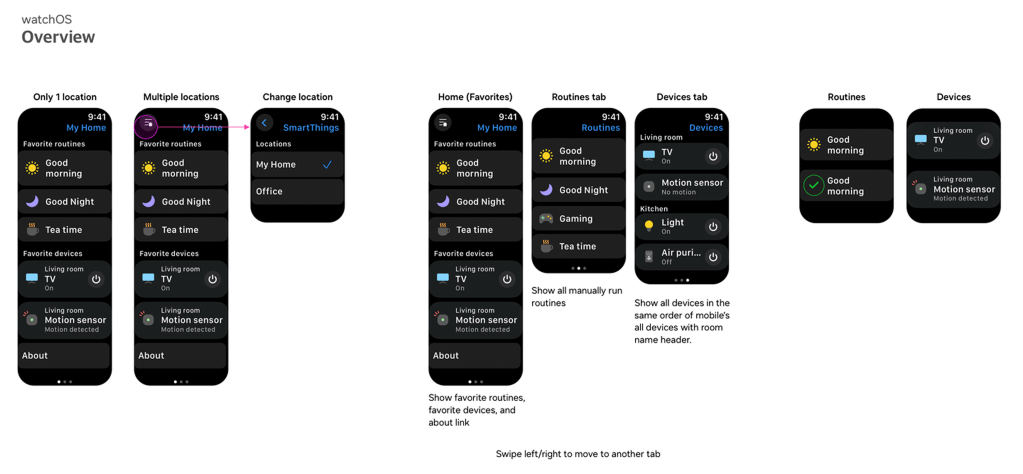 Poważnie ulepszyliśmy aplikację SmartThings Apple Watch. Do tej pory można było uruchamiać ręczne procedury, ale teraz można również przełączać się między lokalizacjami, sterować poszczególnymi urządzeniami i zarządzać inteligentnym domem bez sięgania po telefon. Wyobraź sobie, że odblokowujesz drzwi i włączasz światła na korytarzu, zanim wysiądziesz z samochodu. Wszystko z nadgarstka. To takie proste.