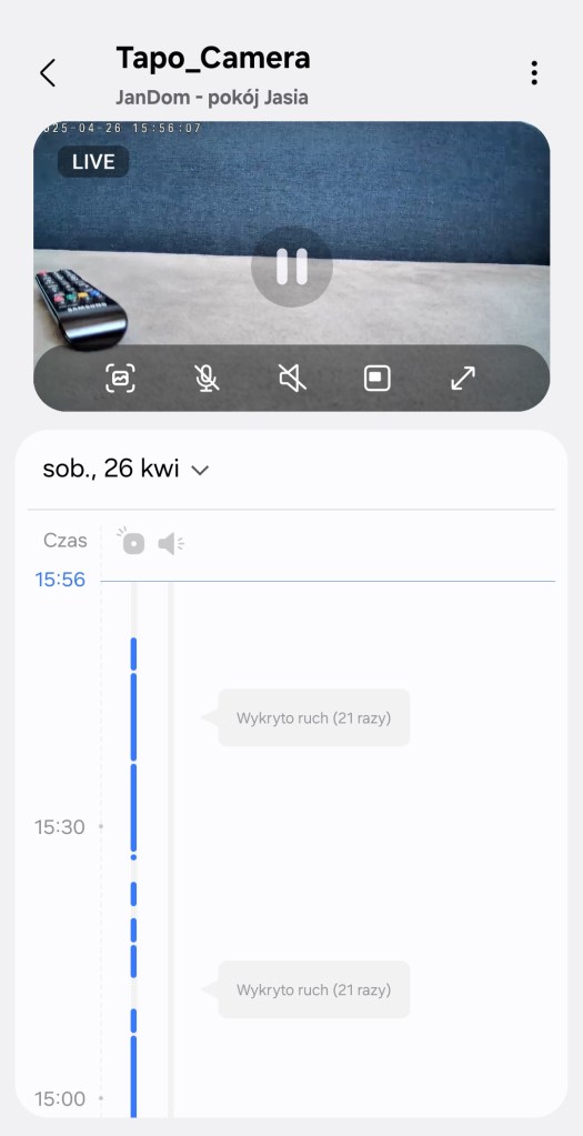 W aplikacji Tapo możemy podejrzeć nagrania z kamery, prześledzić historię alertów, zmienić ustawienia nagrywania, dostosować obszar wykrywania ruchu oraz sprawdzić poziom zapełnienia karty microSD w kamerze.