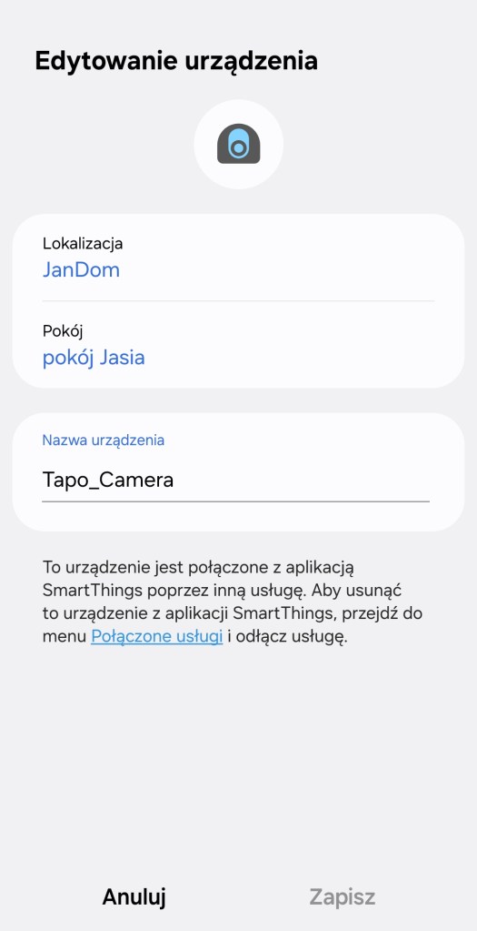 Kamerę konfigurujemy w aplikacji Tapo od TP-Linka. Łączymy urządzenie z naszym telefonem, a następnie z siecią Wi-Fi o częstotliwości 2.4 GHz. W aplikacji Tapo możemy zmienić nazwę kamery, przypisać ją do konkretnego pomieszczenia, a nawet zmienić ikonę wyświetlaną na ekranie głównym aplikacji. Aby dodać kamerę Tapo C210 do SmartThings, należy połączyć usługę Tapo w zakładce „Urządzenia partnerów”, podając login i hasło do konta Tapo.