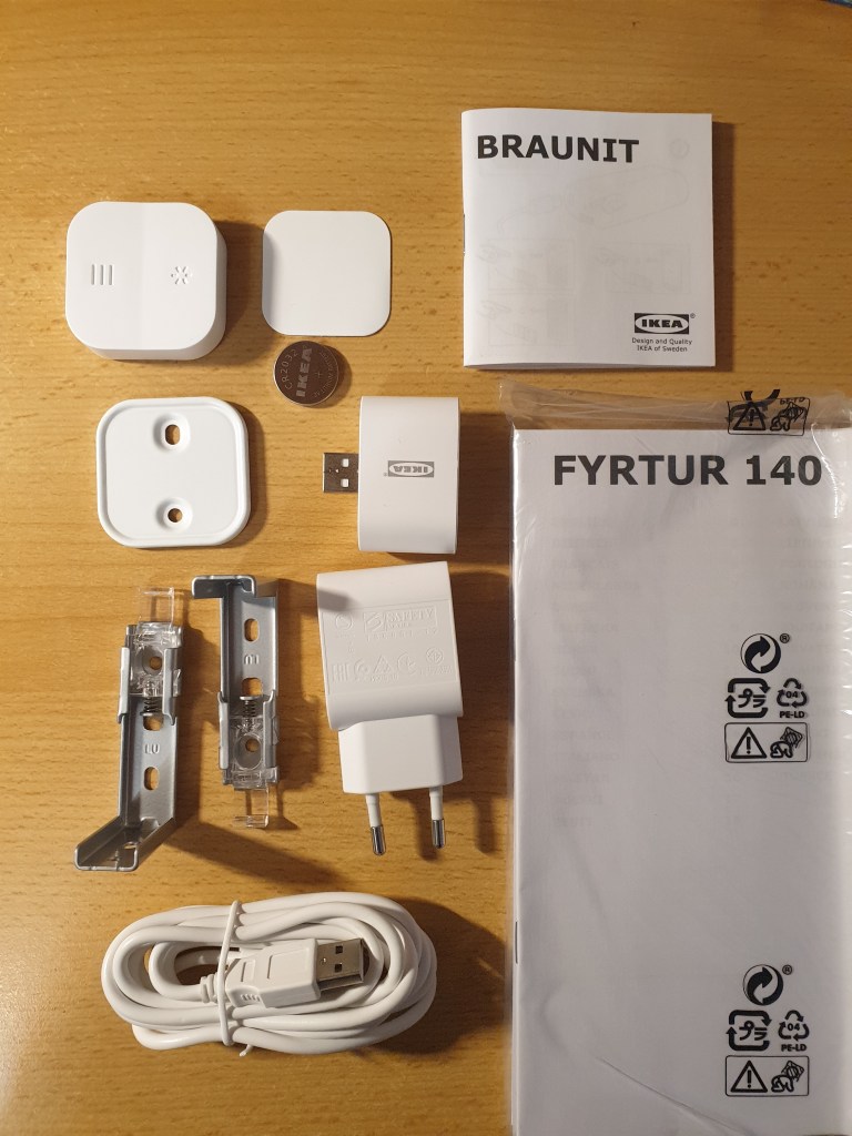 Seria TREDANSEN posiada różne wymiary szerokości rolet 60/80/100/120/140 cm, jest to szerokość płótna. Szerokość ramy żaluzji jest o 4,3 cm szersza. I właśnie tyle miejsca musimy zagospodarować nad oknem. Maksymalna długość rozwinięcia rolety to 195 cm. Roleta jest już wstępnie sparowana z pilotem zdalnego sterowania i repeaterem. Komunikacja odbywa się po protokole Zigbee. Więcej w sekcji montażu. Żaluzja jak już wspomniałem, zasilana jest wymiennym akumulatorem IKEA BRAUNIT. Według IKEA, bateria powinna wystarczyć na 4-6 miesięcy, zanim konieczne będzie doładowanie (roleta otwierana i zamykana raz dziennie). Ładowanie za pomocą dołączonej ładowarki powinno zająć 4-5 godzin.