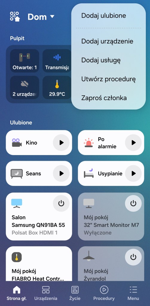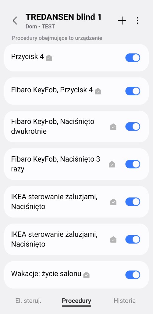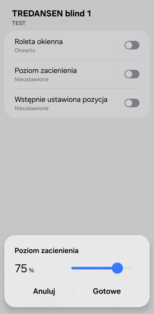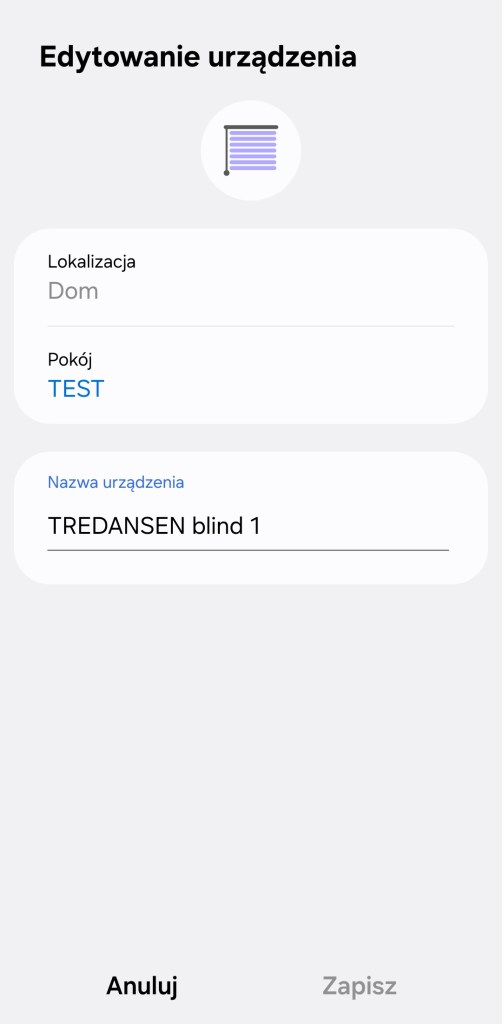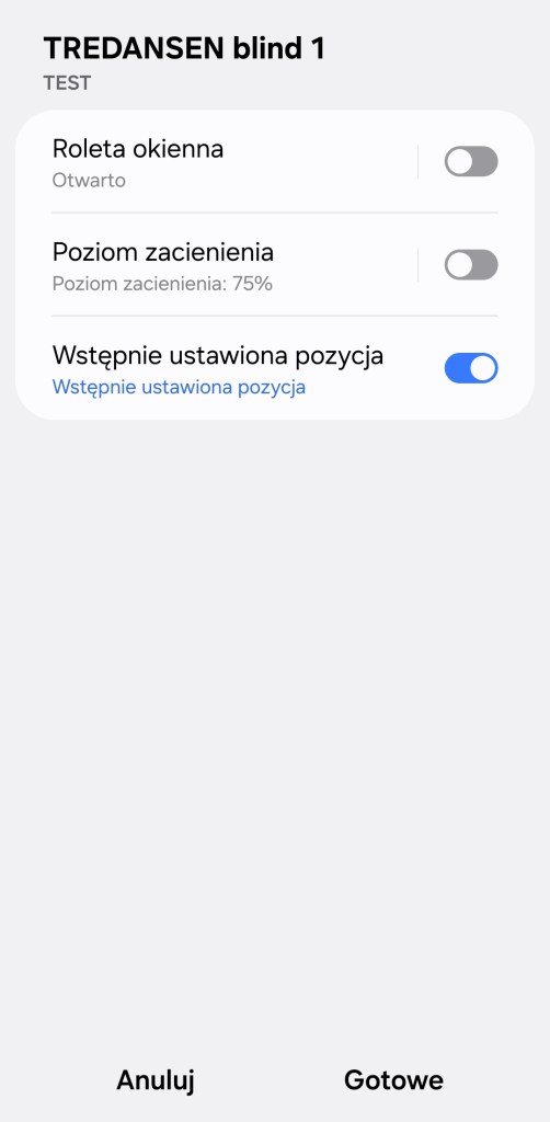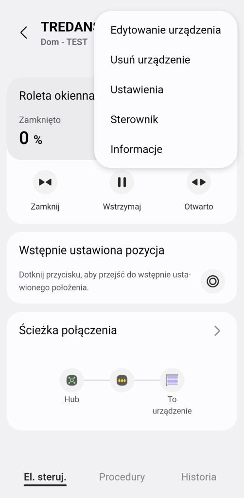 W panelu głównym urządzenia mamy możliwość podejrzeć status rolety (Otwarto, Częściowo otwarto, Zamknięta), a w czasie pracy (Otwieranie lub Zamykanie). Na suwaku możemy wybrać stopień rozwinięcia rolety od 0 – 100%. Poniżej znajdziemy trzy główne przyciski sterujące: Zamknij, Otwarto, Wstrzymaj. Wysyłają one żądanie zamknięcia, otwarcia, bądź wstrzymania zamykania/otwierania żaluzji. Dalej mamy przycisk „Wstępnie ustawiona pozycja”, możemy ją ustawić w ustawieniach w zakresie 0%-100%. Po kliknięciu roleta przejdzie w ustawiony stan zacienienia. W prawym górnym rogu znajduje się wskaźnik poziomu baterii w zakresie 0-100%. Panel „Historii” nie różni się znacznie od innych urządzeń, mamy dostęp do sortowania i przestudiowania historii działań rolety. W ustawieniach „Edytuj” mamy standardową możliwość zmiany nazwy, lokalizacji oraz pokoju. Na ekranie głównym aplikacji, po kliknięciu przycisku „kółka” w kafelku urządzenia, roleta przechodzi z otwarcia do zamknięcia, bądź na odwrót.