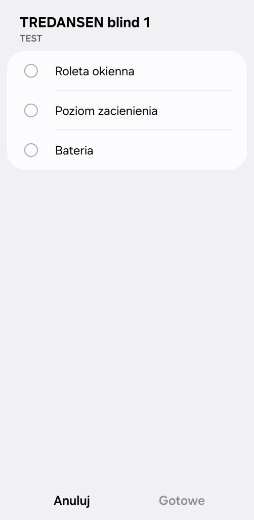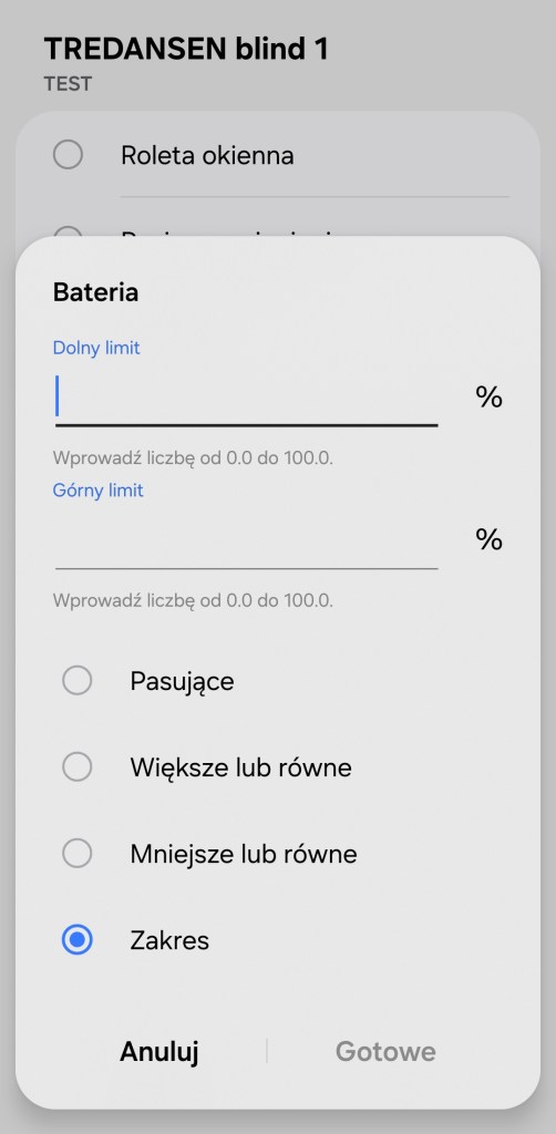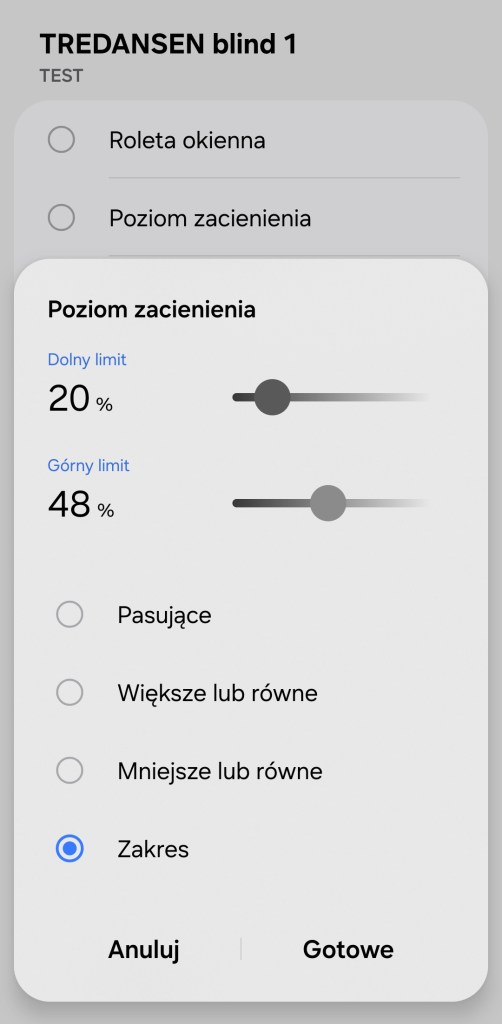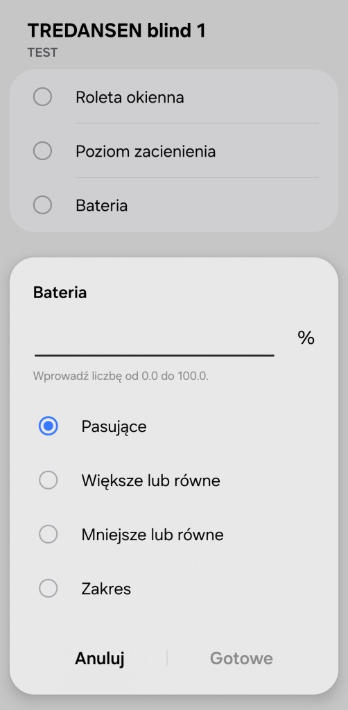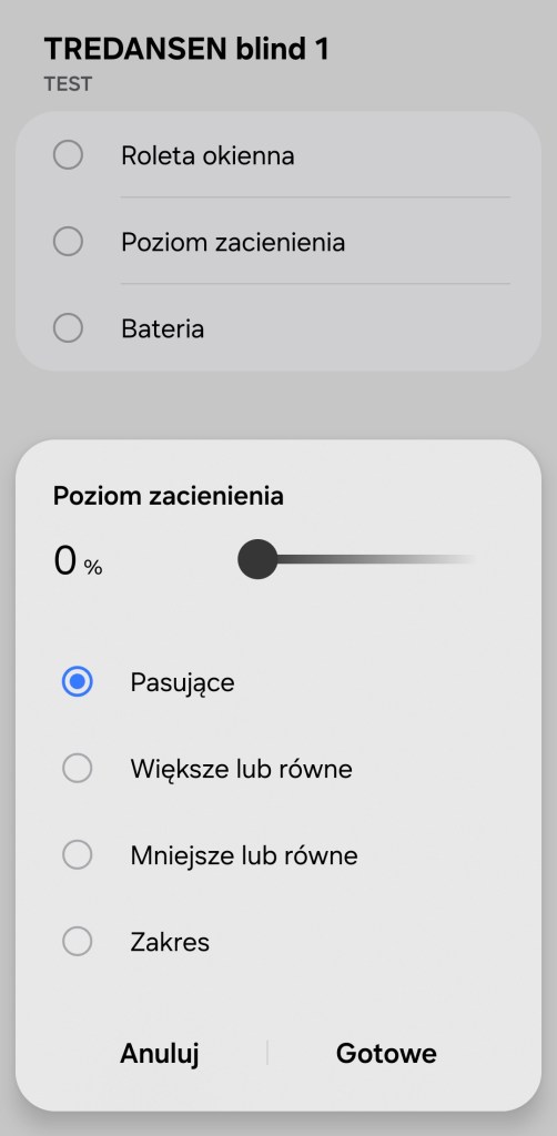 W pierwszej możliwości „Jeśli” urządzenie pozwala na wybranie stanu rolety (Zamknięto, Zamykanie…, Otwarto, Otwieranie…, Częściowo otwarte oraz Otwarto lub zamknięto). Kolejną opcją jest wartość poziomu zacienienia, w możliwość ustawienia zakresu. Na koniec możemy uzyskać powiadomienie o baterii z zakresu 0 – 100% kiedy tylko ustalona przez nas wartość pasuje, jest większa/mniejsza niż odczytana oraz zakres podanych wartości.