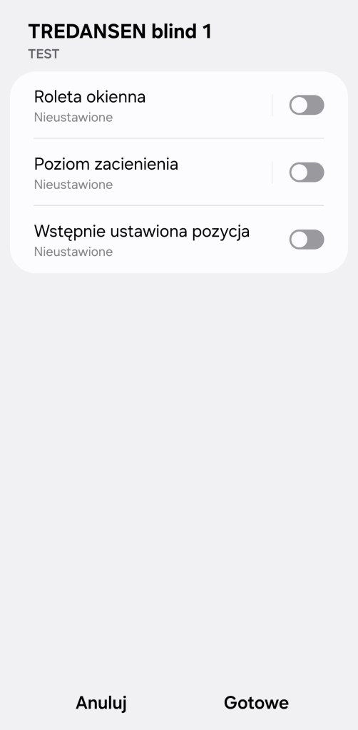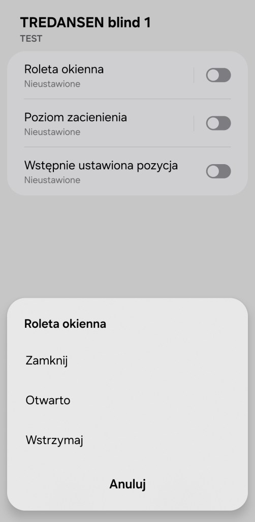 W drugiej możliwości warunku „Wtedy”, posiadamy możliwość zamknięcia, bądź otwarcia rolety okiennej. Ustawienie konkretnego poziomu zaciemnienia z zakresu 0%-100%. Ostatnią możliwością jest przejście do „Wstępnie ustawiona pozycja”.