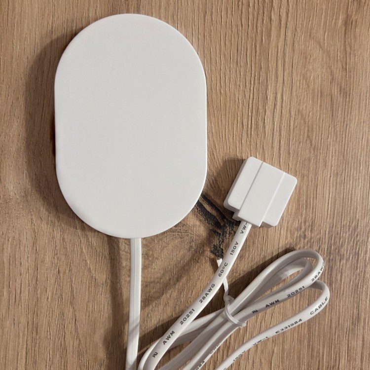 Przymocuj sondę do metalowej płytki za pomocą wbudowanych magnesów. Upewnij się, że sonda jest prawidłowo przymocowana do metalowej płytki. Sonda nie musi być przymocowana kablem skierowanym w dół (jak pokazano poniżej). Może być skierowana w dowolnym kierunku, pod warunkiem prawidłowego przymocowania do metalowej płytki.