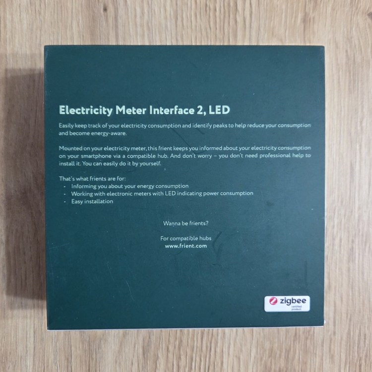 frient Electricity Meter Interface 2 LED model EMIZB-141 Miernik wykorzystuje komunikację po protokole Zigbee 3.0. Obsługuje impulsy LED (konfigurowalny zakres impulsów od 50 do 10 000 impulsów na kWh). Konfigurowalna częstotliwość impulsów jest dostępna z wybranymi hubami. Wymiary głównego modułu urządzenia to 9,5 cm wysokości, 6,5 cm szerokości i 2,23 cm głębokości. Waga sięga 66 gramów. Zasilany jest przez dwie baterie AA, szacowany przez prodycenta czas pracy to 2 lata (przy aktualizacjach co 5 sekund w temperaturze pokojowej). Przystosowany jest tylko do użytku w pomieszczeniach, posiada ochronę IP22. Urządzenie przystosowane jest do pracy w temeperaturze -20°C do +60°C, w wilgotności od 5% do 85% bez kondensacji. Dostępny jest tylko kolor biały.