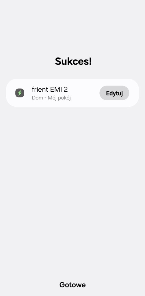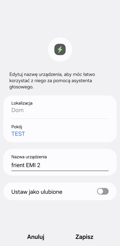 Jeśli posiadamy już zainstalowany sterownik SmartThings Edge, możemy przystąpić do dodania miernika energii Frient do ekosystemu SmartThings. Przechodzimy do aplikacji SmartThings. Na ekranie głównym, klikamy Dodaj ( + ), znajdziesz go w prawym górnym rogu ekranu. Następnie Dodaj urządzenie, w sekcji Urządzenia partnerów wybierz Dodaj. Z listy marek stuknij frient, w następnym kroku wybierz Monitorowanie enegrii, następnie frient Zigbee Switch. Na urządzeniu kliknij i przytrzymaj przycisk resetu przez 15 sekund. Po chwili frient EMI zostanie wykryty i dodany do ekosystemu SmartThings. Po pomyślnym znalezieniu urządzenia możemy zmienić jego nazwę, wybrać pokój, do którego ma trafić. Można dodać urządzenie do panelu ulubionych. Kończymy proces instalacji, klikając Gotowe.