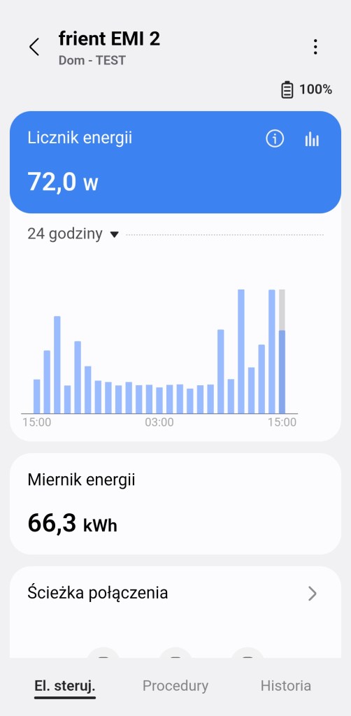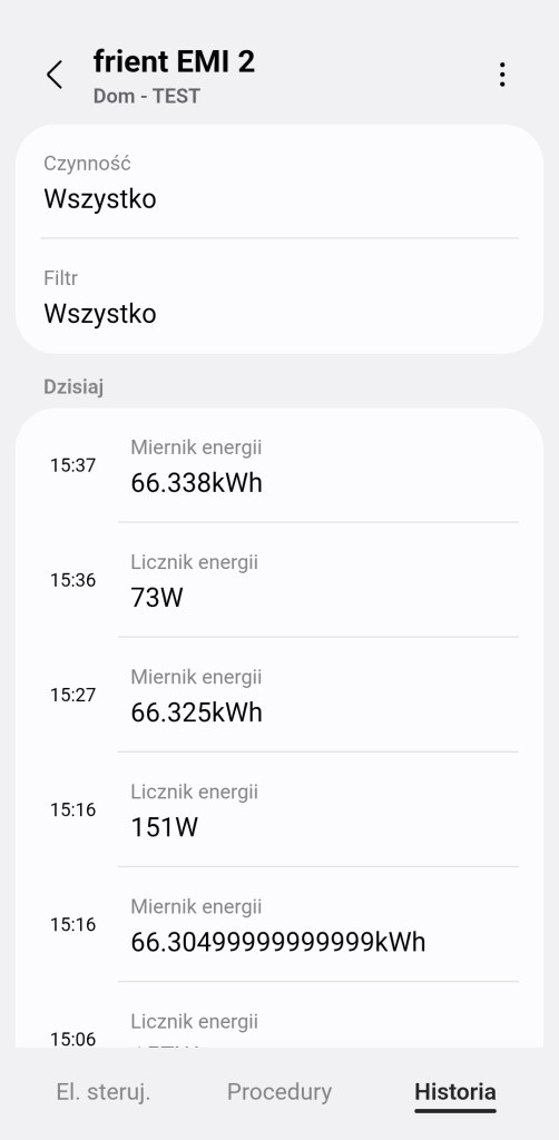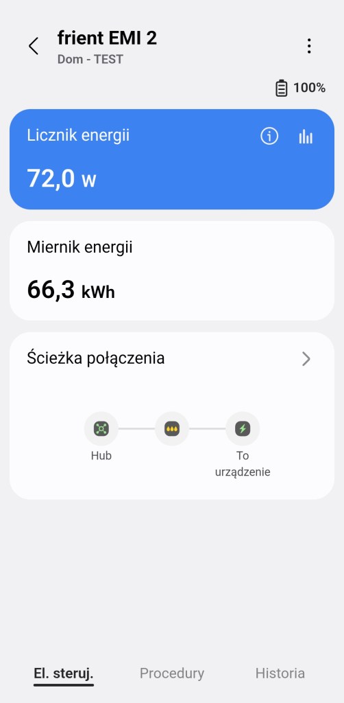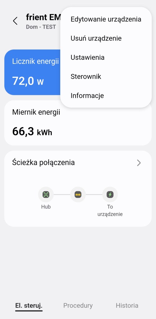 W głównym panelu sterowania urządzeniem Electricity Meter Interface 2 mamy tylko infomacje dotyczące bierzącego zużycia energii elektrycznej. Uzyskamy infomację o liczniku energii, który pokazuje bieżące zużycie oraz miernik enenrgii czyli suma pobranej energii od ostatniego resetu. Ostatnią infomację jest ścieżka jaką połączone jest urządzenie z centralą SmartThings. Na dole znajdziemy sekcję „Procedury” znajdziemy tutaj listę wszystkich automatyzacji, gdzie używany jest miernik. Panel „Historii” nie różni się znacznie od innych urządzeń, mamy dostęp do sortowania i przestudiowania historii działań urządzenia z ostatniego tygodnia. W ustawieniach „Edytuj” mamy standardową możliwość zmiany nazwy, pokoju oraz możliwość dodania do panelu „Ulubione”.