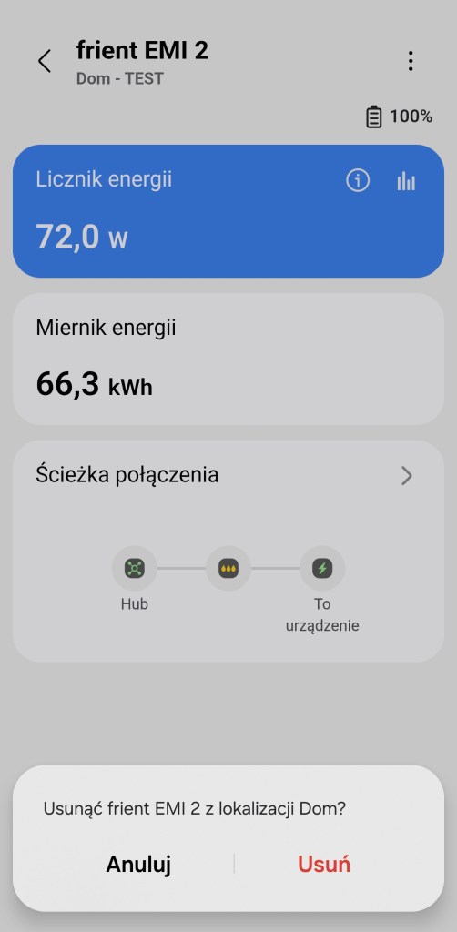 Aby skutecznie usunąć miernik energii frient z ekosystemu SmartThings, należy wejść w główny panel urządzenia. Kliknąć Więcej opcji ( ⋮ ), a następnie wybieramy Usuń urządzenie. Następnie potwierdzamy operację, stukając Usuń. Teraz należy przystąpić do resetu przełącznika.