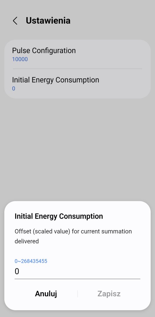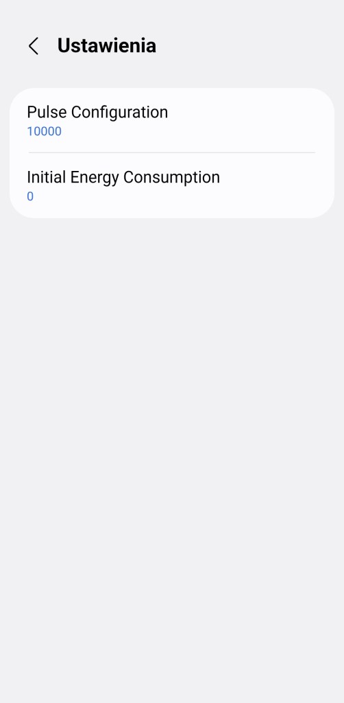Pamiętaj żeby po dodaniu urządzenia przejść do jego ustawień i ustawić parametr Pulse Configuration. Częstotliwość impulsów znajdziesz na obudowie swojego licznika energii.