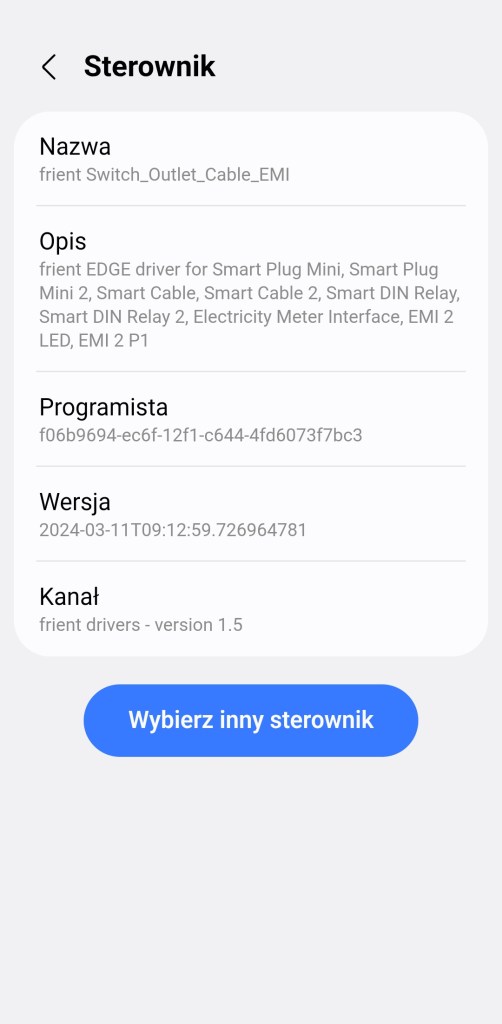 Jeśli Twoje urządzenie korzysta już ze sterownika brzegowego jest możliwośc jego zmiany. Producent cały czas poprawia swoje sterowniki, wydając nowsze wersje aklualna to 1.5. Aby zaktualizować sterownik należy zainstlować nową wersję i wybrać ją z poziomu aplikacji SmartThings, możesz to zrobić wykonując następujące czynności. Aby zmienić sterownik należy wejść panel sterowania urządzenia. Następnie klikamy Więcej opcji ( ⋮ ), z listy wybieramy Sterownik i Wybierz inny sterownik. Z listy dostępnych wybierz ten który najlepiej działa oraz posiada rozbudowane funkcje, których chcesz użyć. Ja polecam używać sterowniki bezpośrednio stworzone przez producenta frient.