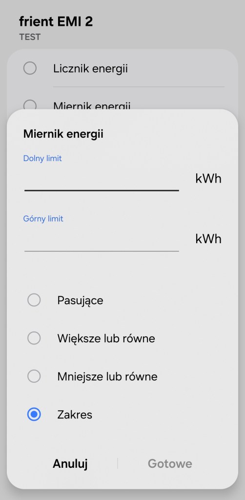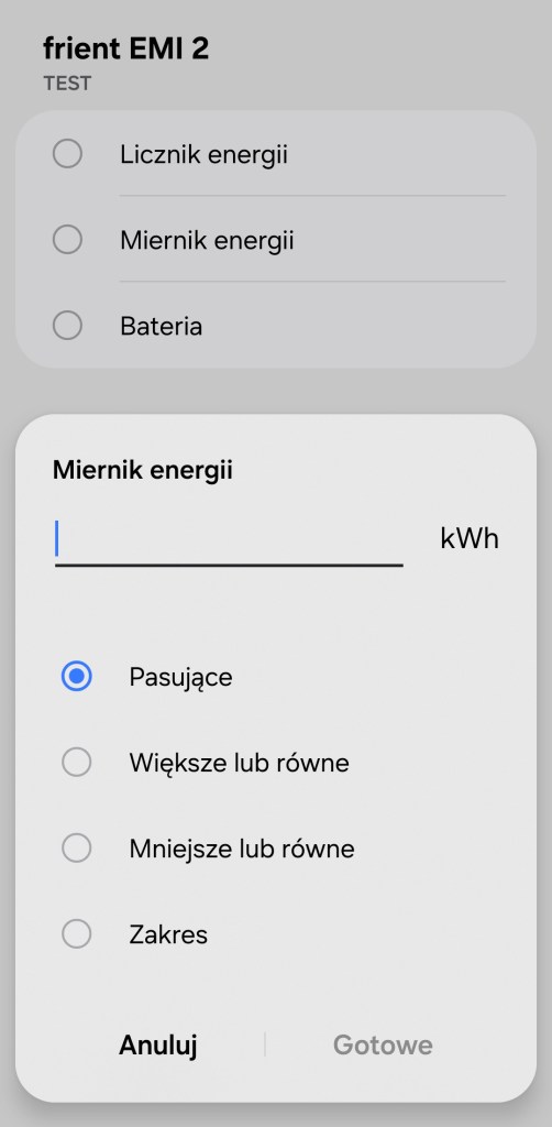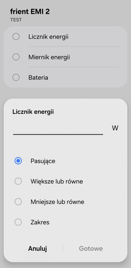 Tworzenie procedur (dawniej automatyzacje) „Jeśli … to Wtedy” musimy podzielić na dwa etapy, ponieważ znacznie różnią się dostępne opcje jeśli inicjujemy warunek „Jeśli”. W pierwszej możliwości „Jeśli” urządzenie pozwala na wybranie opcji „Licznik energii”, gdzie wpisujemy wartość w Watach (W). Następnie jest „Miernik energii’, gdzie jednostką jest kilo watogodzina (kWh) oraz „Bateria” sygnalizująca jej bieżący poziom – we wszystkich tych wskazaniach możemy np. otrzymać powiadomienie, kiedy tylko ustalona przez nas wartość pasuje, jest większa/mniejsza niż odczytana oraz zakres podanych wartości.