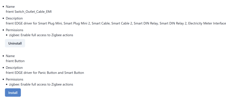 Przed dodaniem przełącznika do aplikacji SmartThings. Musimy uzyskać dostęp do sterowników SmartThings Edge, które pozwolą na prawidłowe wykrycie urządzenia oraz pozwolą sterować przełącznikiem lokalnie w centrali (bez dostępu do Internetu). Dodatkowo pozwalają skorzystać z dodatkowych funkcji, przewidzianych przez producenta. Pełną instrukcję dodania sterowników i ich listę znajdziesz w tym wpisie. W tym celu instalacji sterownika SmartThings Edge należy wejść na stronę (https://bestow-regional.api.smartthings.com/invite/gpjG1VYQ4924) oraz zalogować na konto, na którym został zbudowany Twój inteligentny dom. Zaakceptować warunki przystąpienia a następnie możemy wybrać nowe sterowniki do zainstalowania. Klikając w Available Drivers (Dostępne sterowniki), wybieramy pożądane przez nas sterowniki urządzeń, w tym wypadku „frient Outlet_Cable_EMI”, instalujemy je poprzez kliknięcie Install. W każdej chwili możemy odinstalować, klikając Uninstall. Pamiętajmy, że na chwilę obecną możemy zainstalować sterowników Edge maksymalnie 50.