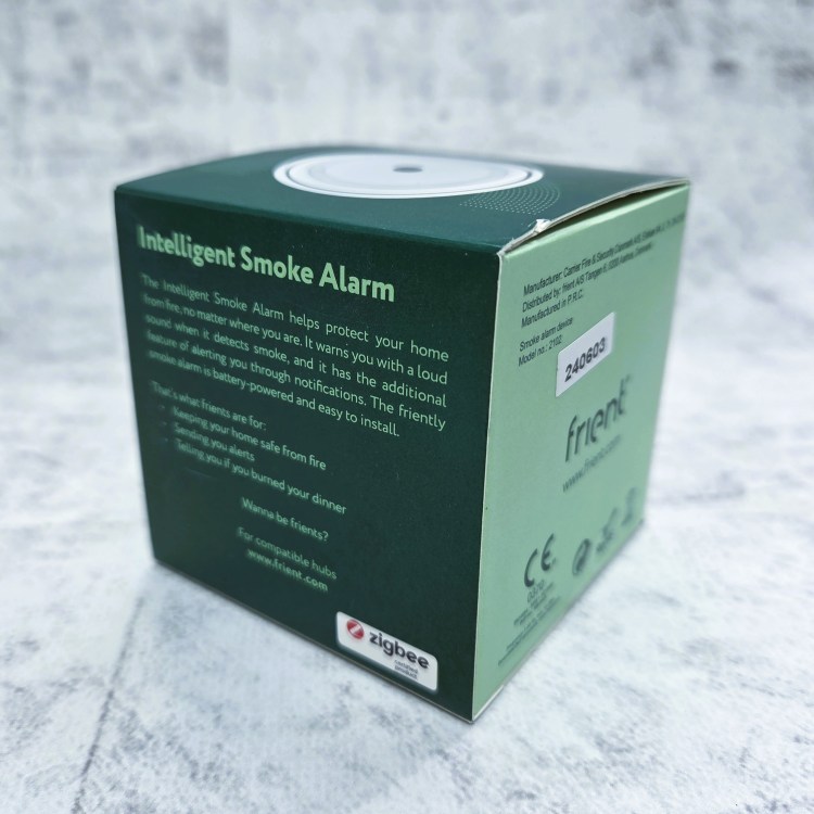 frient Intelligent Smoke Alarm to inteligentny czujnik dymu. Urządzenie jest wyposażone w optyczny sensor dwutlenku węgla oraz syrenę alarmową o mocy 85 dB/3m. Sensor wykorzystuje komunikację po protokole Zigbee 3.0. Zasilany jest przez baterie CR123A, szacowany przez prodycenta czas pracy to 3 lata (przy aktualizacjach co 5 sekund w temperaturze pokojowej). Wymiary czujnika to 6 cm x 6 cm i 4cm głębokości. Urządzenie przystosowane jest do pracy w temeperaturze 0°C do +50°C, w wilgotności od 10% do 95% bez kondensacji. Posiada klasę pyłoszczelności IP20. Dostępny jest tylko kolor biały. Czujnik posiada certyfikaty: CE, RoHS i REACH.