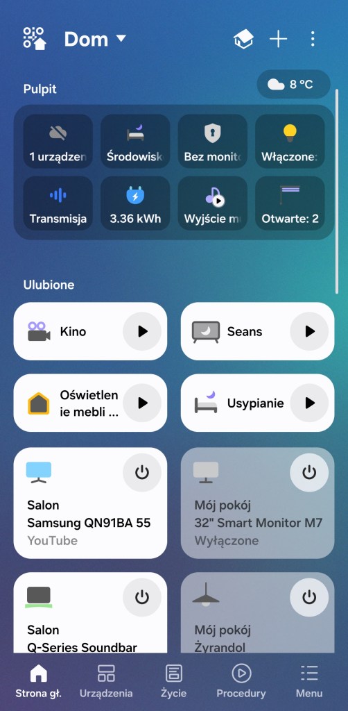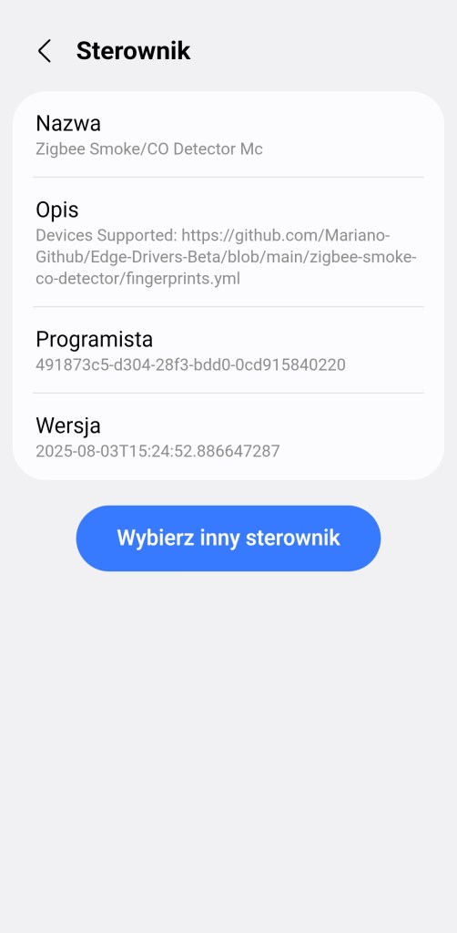 Twoje nowe urządzenie już korzysta ze sterownika brzegowego istnieje jednak możliwość jego zmiany. Producent cały czas poprawia swoje sterowniki, wydając nowsze wersje aktualna nosi numer 1.5. Aby zaktualizować sterownik należy na początku zainstalować nową wersję i wybrać ją z poziomu aplikacji SmartThings, możesz to zrobić wykonując następujące czynności. Aby zmienić sterownik należy wejść panel sterowania urządzenia. Następnie klikamy Więcej opcji ( ⋮ ), z listy wybieramy Sterownik i Wybierz inny sterownik. Z listy dostępnych wybierz ten który najlepiej działa oraz posiada rozbudowane funkcje, których chcesz użyć. Ja polecam używać sterowniki bezpośrednio stworzone przez producenta frient.