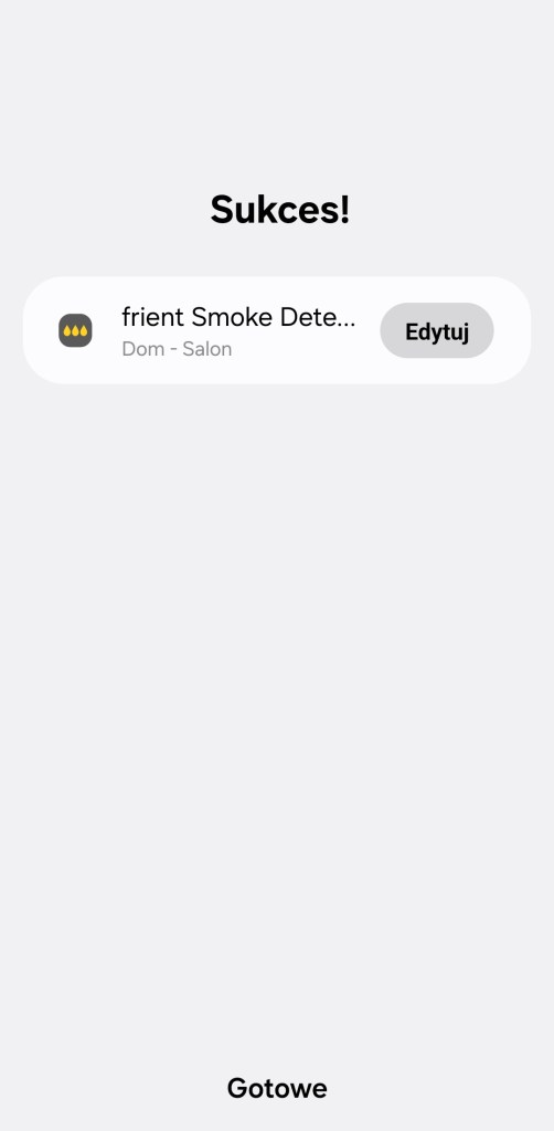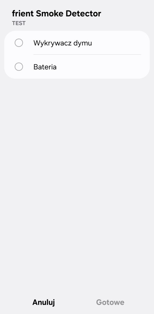 Jeśli posiadamy już zainstalowany sterownik SmartThings Edge, możemy przystąpić do dodania sensora frient do ekosystemu SmartThings. Pamiętaja, aby wyciągnąć zaślebkę baterii. Przechodzimy do aplikacji SmartThings. Na ekranie głównym, klikamy Dodaj ( + ), znajdziesz go w prawym górnym rogu ekranu. Następnie Dodaj urządzenie, w sekcji Urządzenia partnerów wybierz Dodaj. Z listy marek stuknij frient, w następnym kroku wybierz Wykrywacz dymu, następnie frient products. Pomiń skanowanie kodu QR. Na urządzeniu kliknij i przytrzymaj przycisk resetu przez 15 sekund. Po chwili frient Smoke Alarm zostanie wykryty i dodany do ekosystemu SmartThings. Po pomyślnym znalezieniu urządzenia możemy zmienić jego nazwę, wybrać pokój, do którego ma trafić. Można dodać urządzenie do panelu ulubionych. Kończymy proces instalacji, klikając Gotowe. Odczyty czujnika pojawią się po dłuższej chwili.