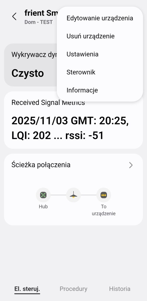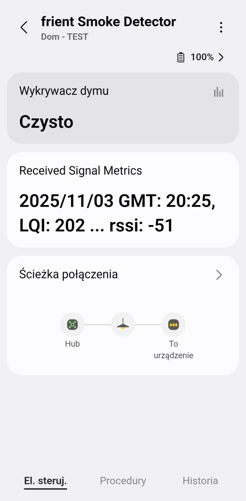 W głównym panelu sterowania urządzeniem frient Intelligent Smoke Alarm mamy jedynie informacje o aktualnym stanie czujnika dymu „Wykrywacz dymu” z alertem: „Czysto” lub „Wykryto dym”. Po naciśnięciu ikony wykresu, ukaże się oś czasu (do wybory: minuty, godziny i dni) z ukazanymi alertami i ich ilością w danym czasie. Następnie pokazano moc sygnału. Będą to wartości RSSI (ang. Received Signal Strength Indicator) i LQI (ang. Link Quality Indicator), pomocne w budowaniu silnej sieci Zigbee. Ostatnią infomację jest ścieżka jaką połączone jest urządzenie z centralą SmartThings. Na dole znajdziemy sekcję „Procedury” znajdziemy tutaj listę wszystkich automatyzacji, gdzie używany jest monitor. Panel „Historii” nie różni się znacznie od innych urządzeń, mamy dostęp do sortowania i przestudiowania historii działań urządzenia z ostatniego tygodnia. W ustawieniach „Edytuj” mamy standardową możliwość zmiany nazwy, pokoju oraz możliwość dodania do panelu „Ulubione”.